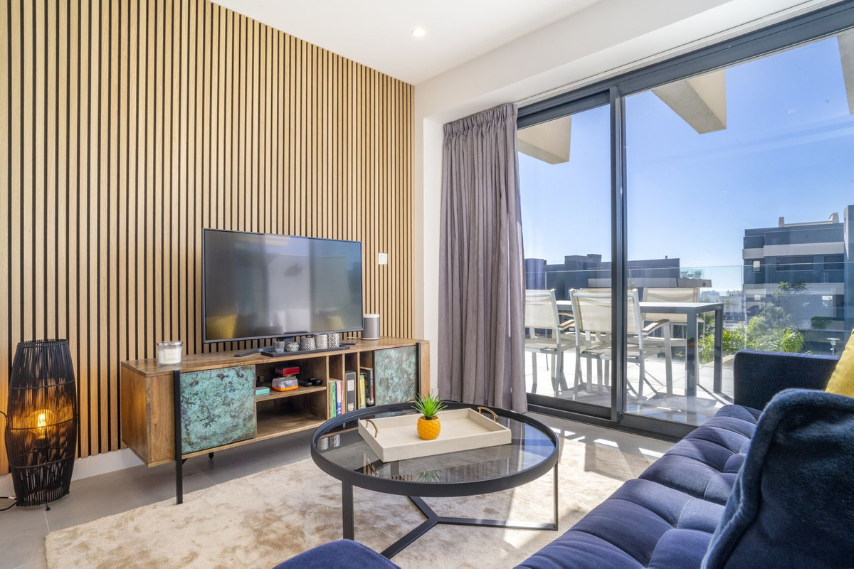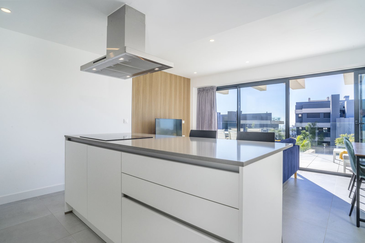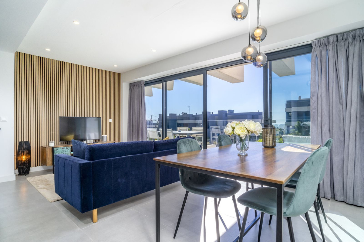 The apartment enjoys a privileged south-facing orientation, allowing natural light to flood the interior throughout the day. The spacious open-plan living and dining area connects seamlessly with a generous 27.83 m² terrace, creating a harmonious indoor-outdoor living experience. From here, you enjoy open views over the beautifully landscaped gardens and communal pool area, as well as a subtle glimpse of the Mediterranean.