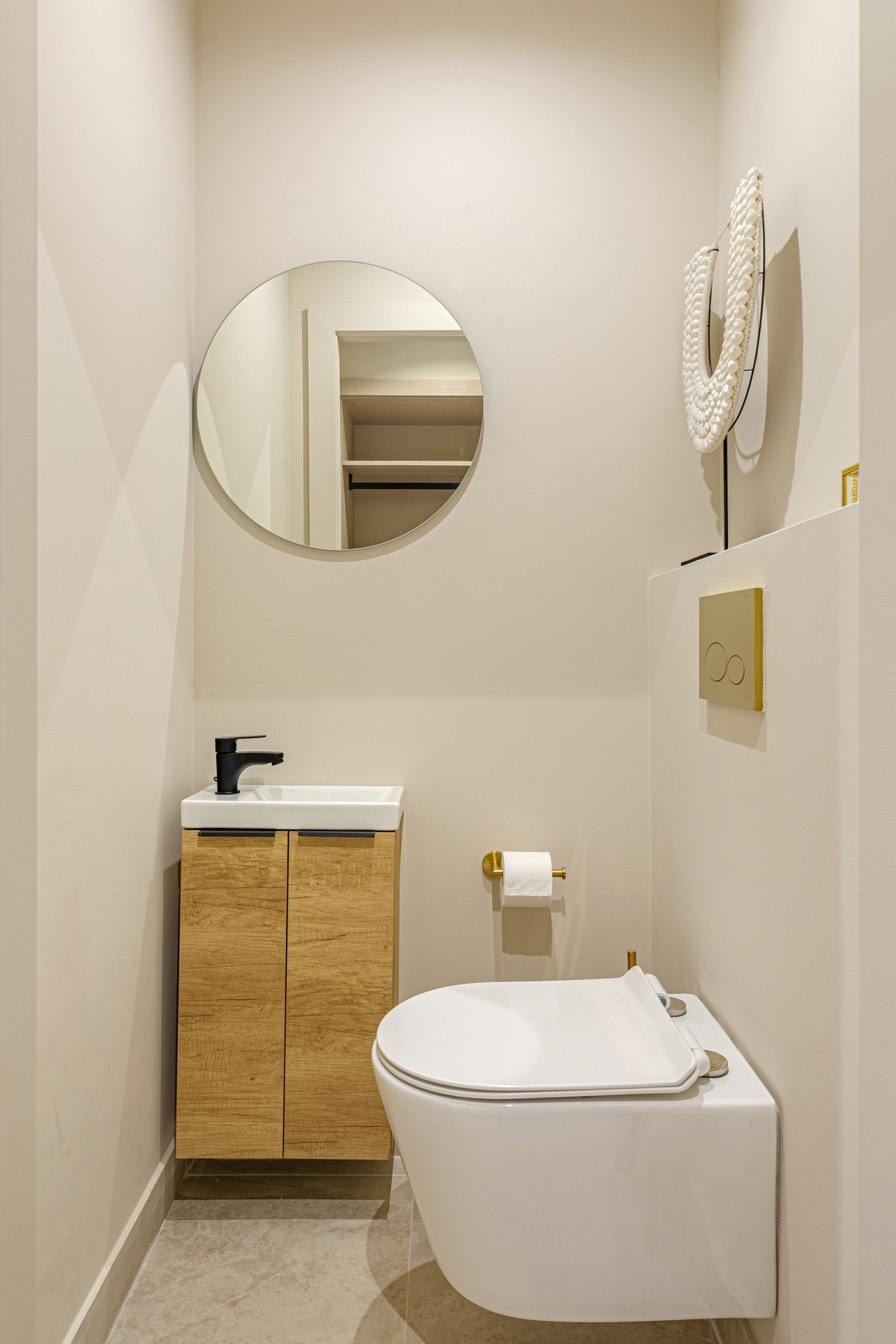 Both bedrooms feature en-suite bathrooms, complemented by a separate guest toilet, providing comfort and privacy for residents and visitors alike. The interior flows seamlessly onto a spectacular 61m² west-facing terrace, ideal for outdoor dining, entertaining, or simply enjoying the afternoon sun and evening sunsets.