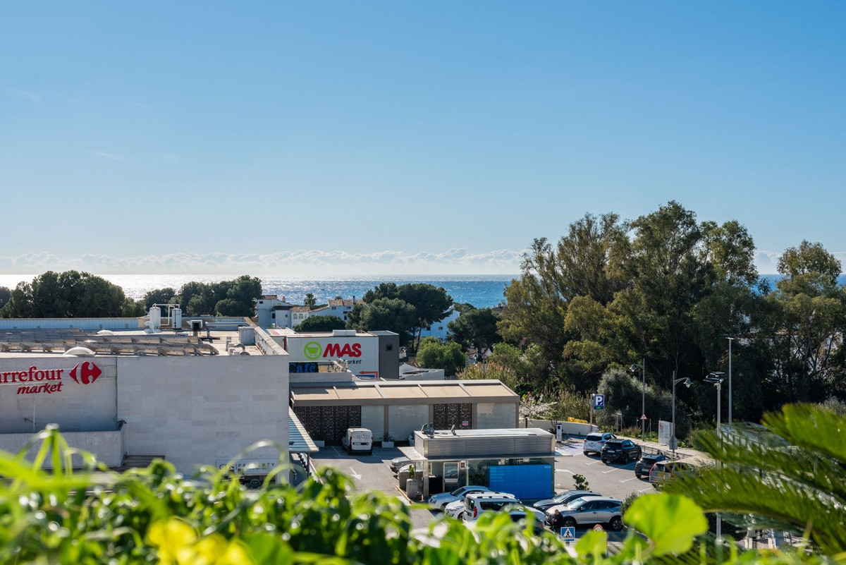 A floating staircase leads to the three-bedroom level with two bathrooms, both with underfloor heating. From here, you can access a stunning solarium with a pergola and with sea views, perfect for relaxing or entertaining.