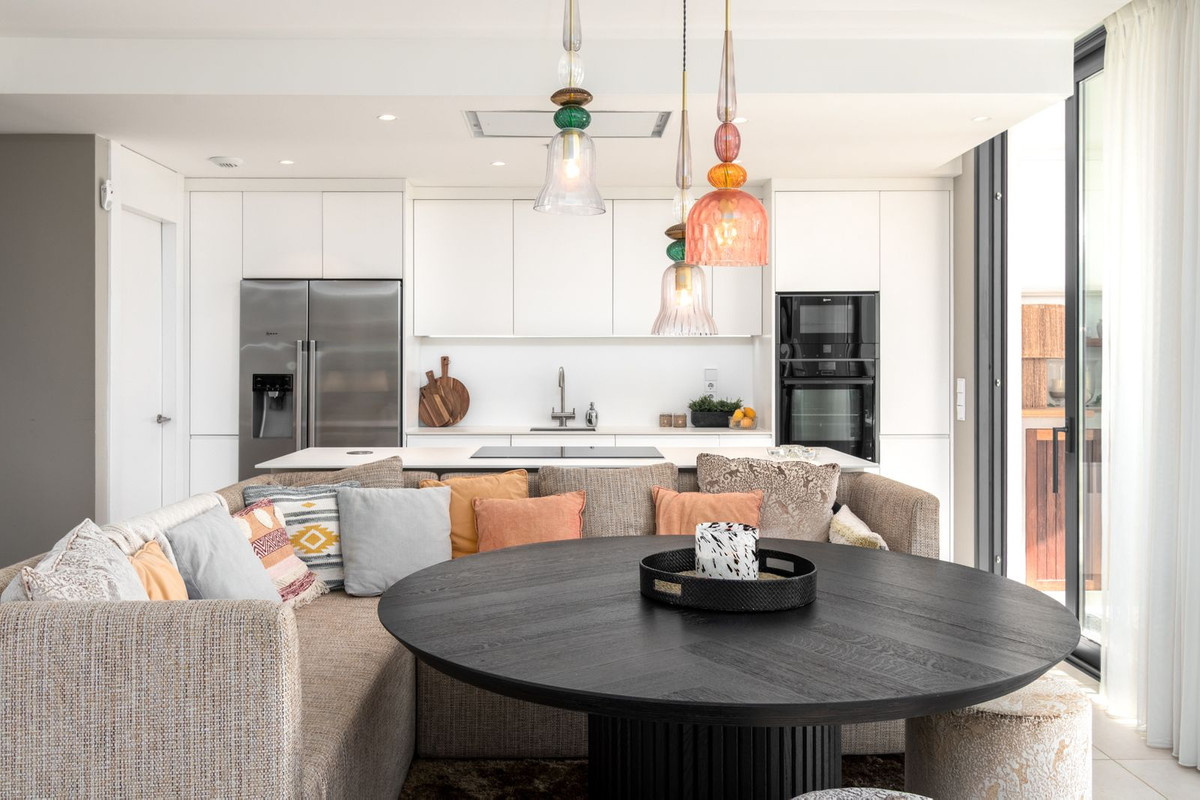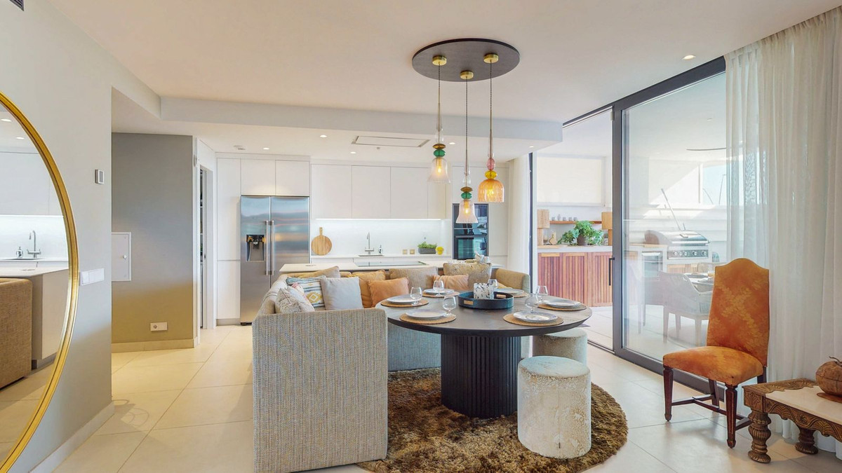 Living Room: Expansive and light-filled with floor-to-ceiling glass doors opening onto the terrace. Generous lounge and dining areas designed for refined entertaining and relaxed living.