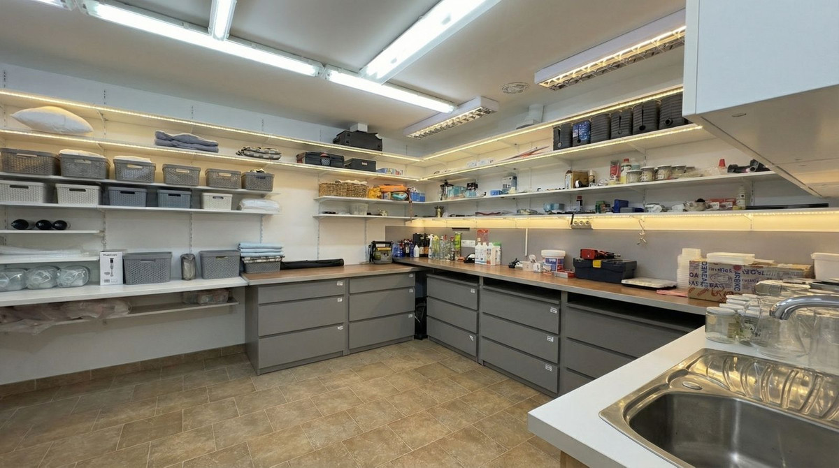 A marble staircase leads to the lower level. Here you will find a guest apartment with an ensuite bathroom and its own spacious kitchen. Next to the guest quarters, passing through the massive garage (55 m²!), is a fourth bedroom, that can also be used as an office. Additionally, this level houses the technical room (with the pool pump) and a storage/workshop area of 30 m². Given the space and the existing plumbing, this floor offers ample possibilities to create 2 or 3 extra guest rooms—ideal for starting a B&B.