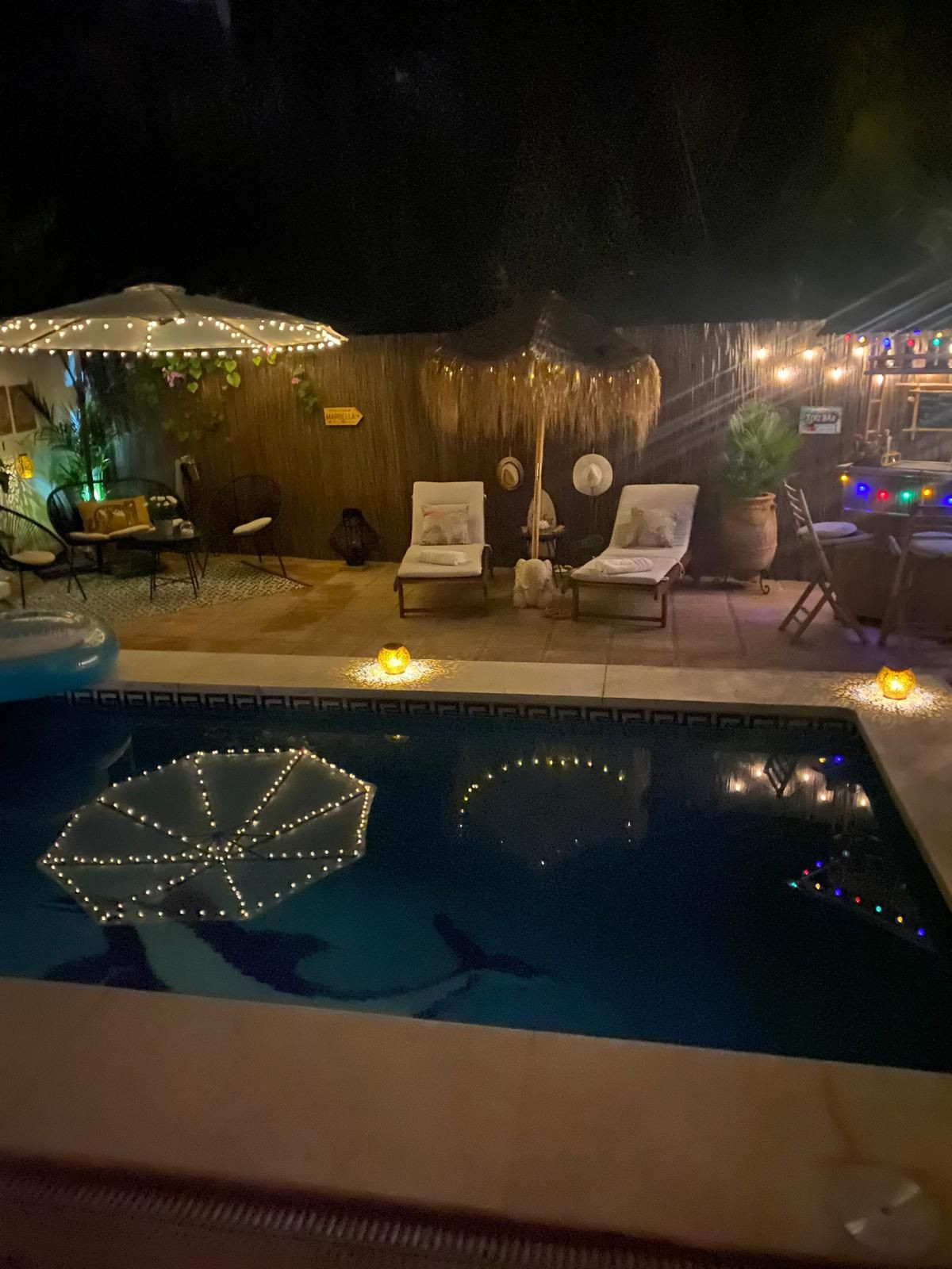 Around the pool is a chill-out area with sun loungers, an outdoor kitchen with a barbecue, and a bar area. Traditional elements such as terracotta floors, solid wood doors and windows, and beamed ceilings characterize the architecture of this charming house.
