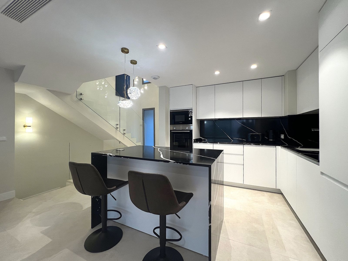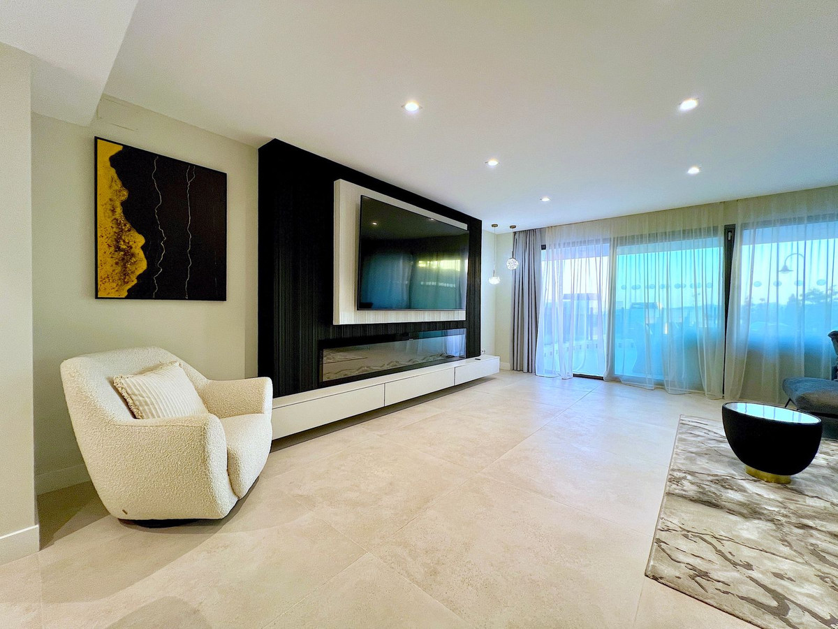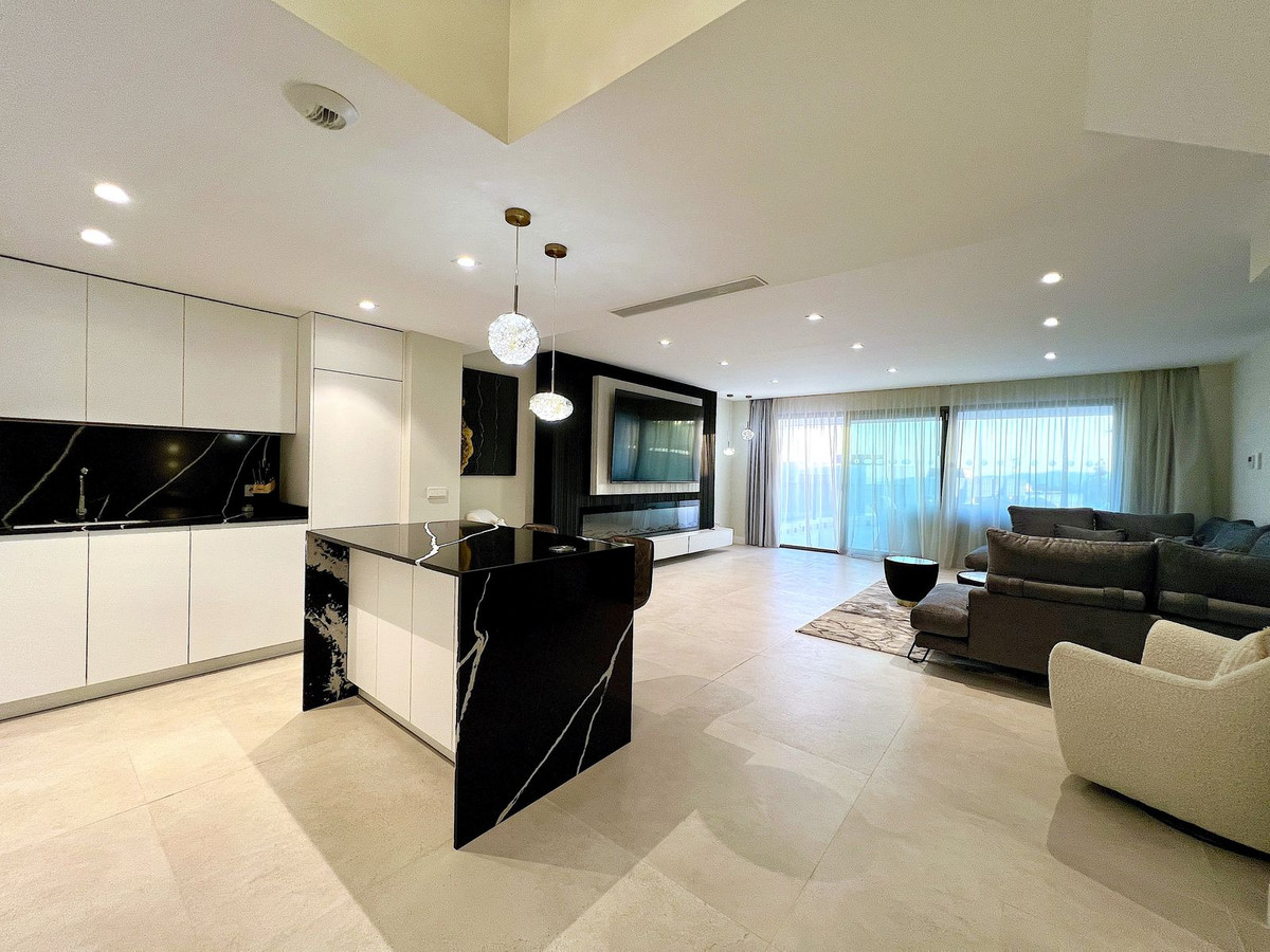 The heart of the home is a bright, open-plan space where the designer kitchen, featuring white cabinetry, onyx marble accents, a central island, and Bosch appliances, flows seamlessly into an elegant living room dominated by a full-wall gas fireplace. From here, you can access a spacious south-facing terrace, perfect for watching the sunsets and enjoying the sun throughout the day.