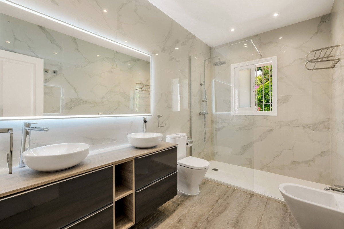 Set within this privileged setting, this beautifully renovated villa has been designed for effortless living, with generous proportions, abundant natural light and a warm, inviting ambience from the moment you step inside. The main level features three spacious bedrooms and three bathrooms, along with a striking double height living room with a wood burning fireplace and large windows that frame the greenery outside. The fully updated, well equipped kitchen is bright and functional, ideal for daily life and for entertaining. Several covered terraces extend the living space outdoors, perfect for morning coffee or relaxed evenings in the shade.