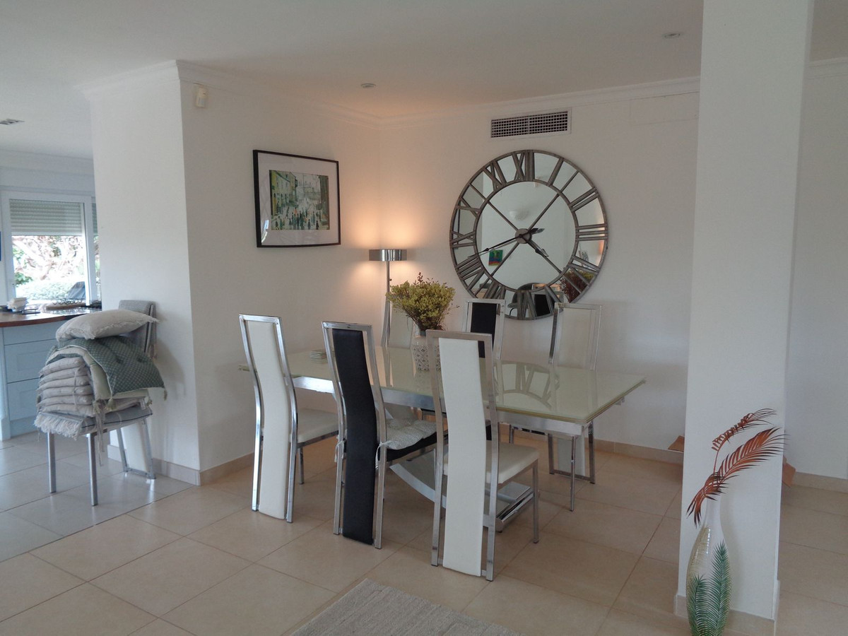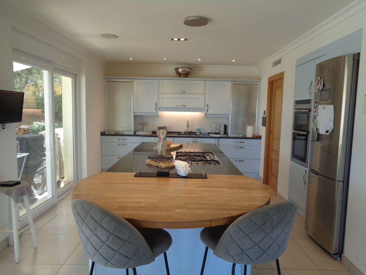 A beautiful dining area is between the lounge and the kitchen. Moving into the spacious kitchen which has a large centre island/breakfast bar with modern utilities and appliances. The kitchen is a very welcoming space which is also flooded with light having three sets of double patio doors leading out to the terraces, gardens and swimming pool.