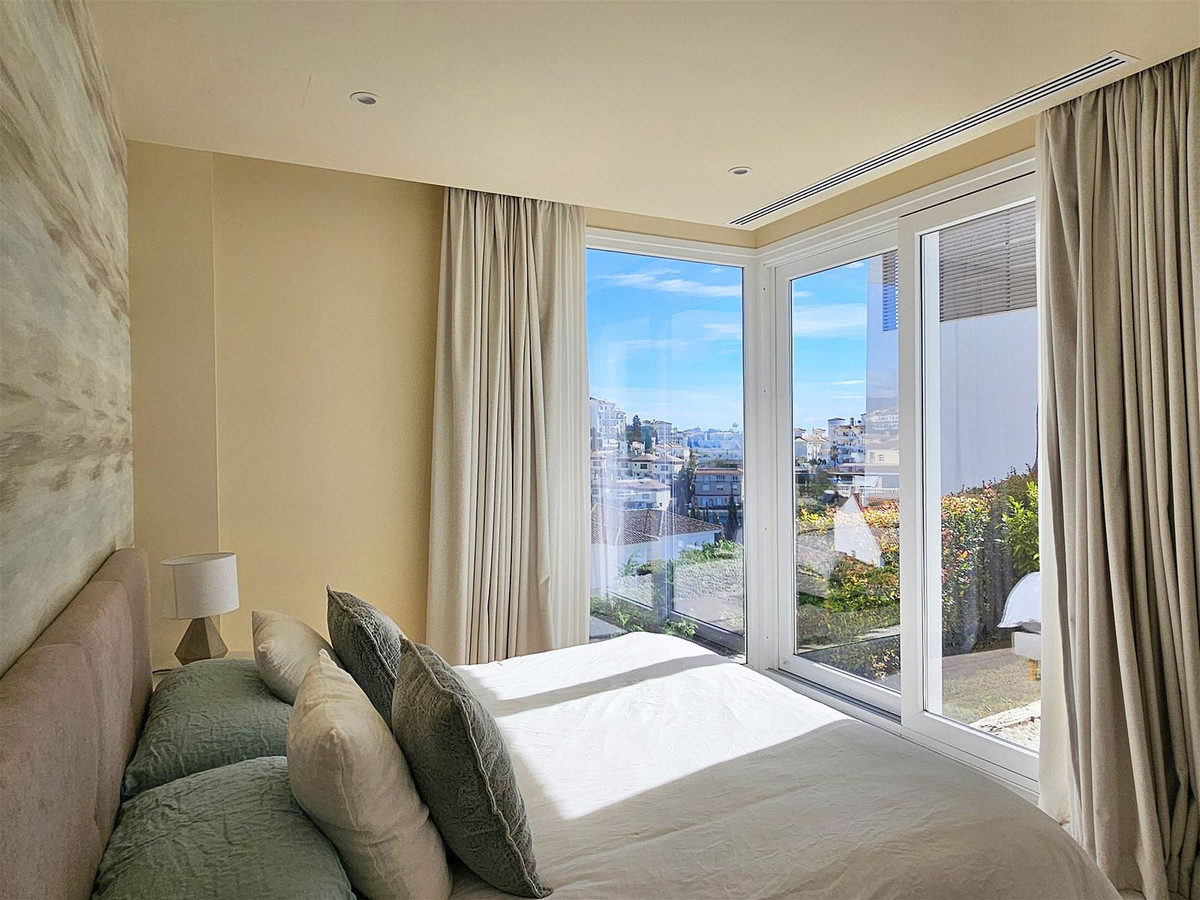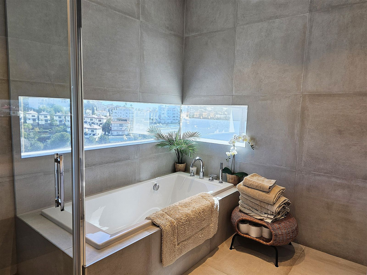 Upstairs, on the first floor, the landing is currently set up as a home office and leads out to a large terrace. Two further en-suite bedrooms are located on this floor, including the master suite, which enjoys particularly striking sea and golf views, a walk-in closet, and direct access to the terrace. The master bathroom features both a bathtub and separate shower.