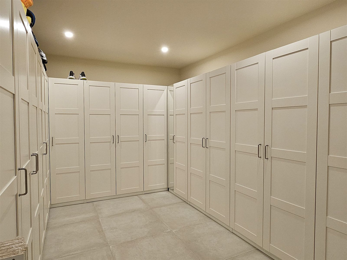 The lower basement level adds exceptional versatility, offering another spacious and bright double bedroom with fitted wardrobes, a separate large bathroom with walk-in shower, an expansive closet / storage area, laundry room, machine room, gym space, and a double garage with room for two vehicles.