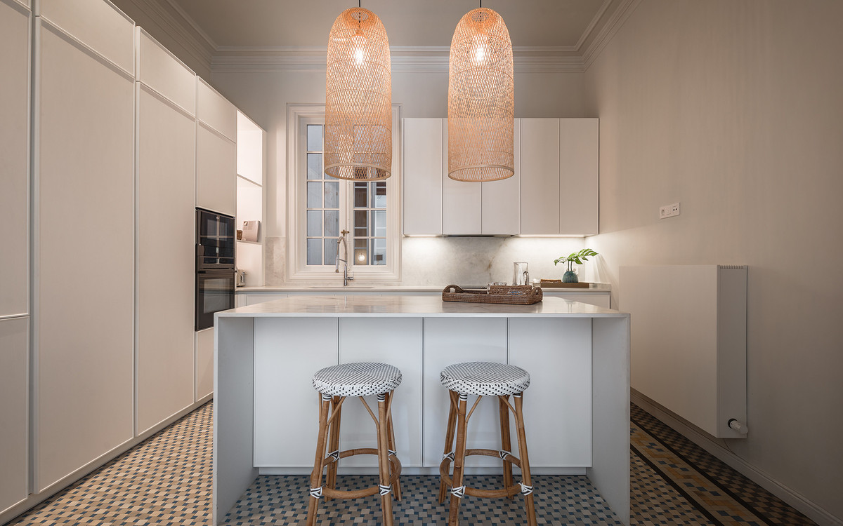 The materials and finishes reflect a careful combination of tradition and contemporary comfort. The walls feature artisanal lime stucco, microcement, and eco-friendly paint by Farrow & Ball. The original Nolla mosaic flooring, meticulously restored, is preserved throughout most of the property, adding character and aesthetic coherence. The doors and windows from 1922 have been recovered, maintaining the original woodwork and updating hardware and mechanisms to ensure functionality.