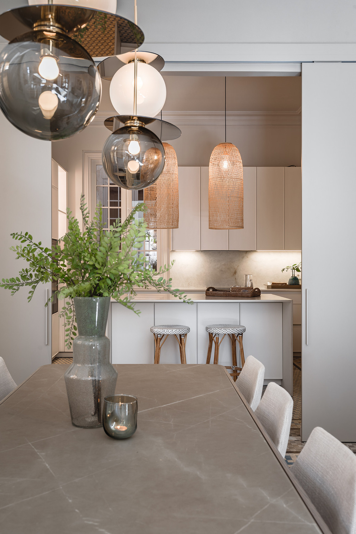This impressive residence skillfully blends the classic elegance of its original architecture with a serene and luminous contemporary interior design. High ceilings, original moldings, and large windows harmonize with pure-lined furnishings, noble materials, and a carefully curated selection of lighting fixtures, creating an atmosphere that is both sophisticated and natural.