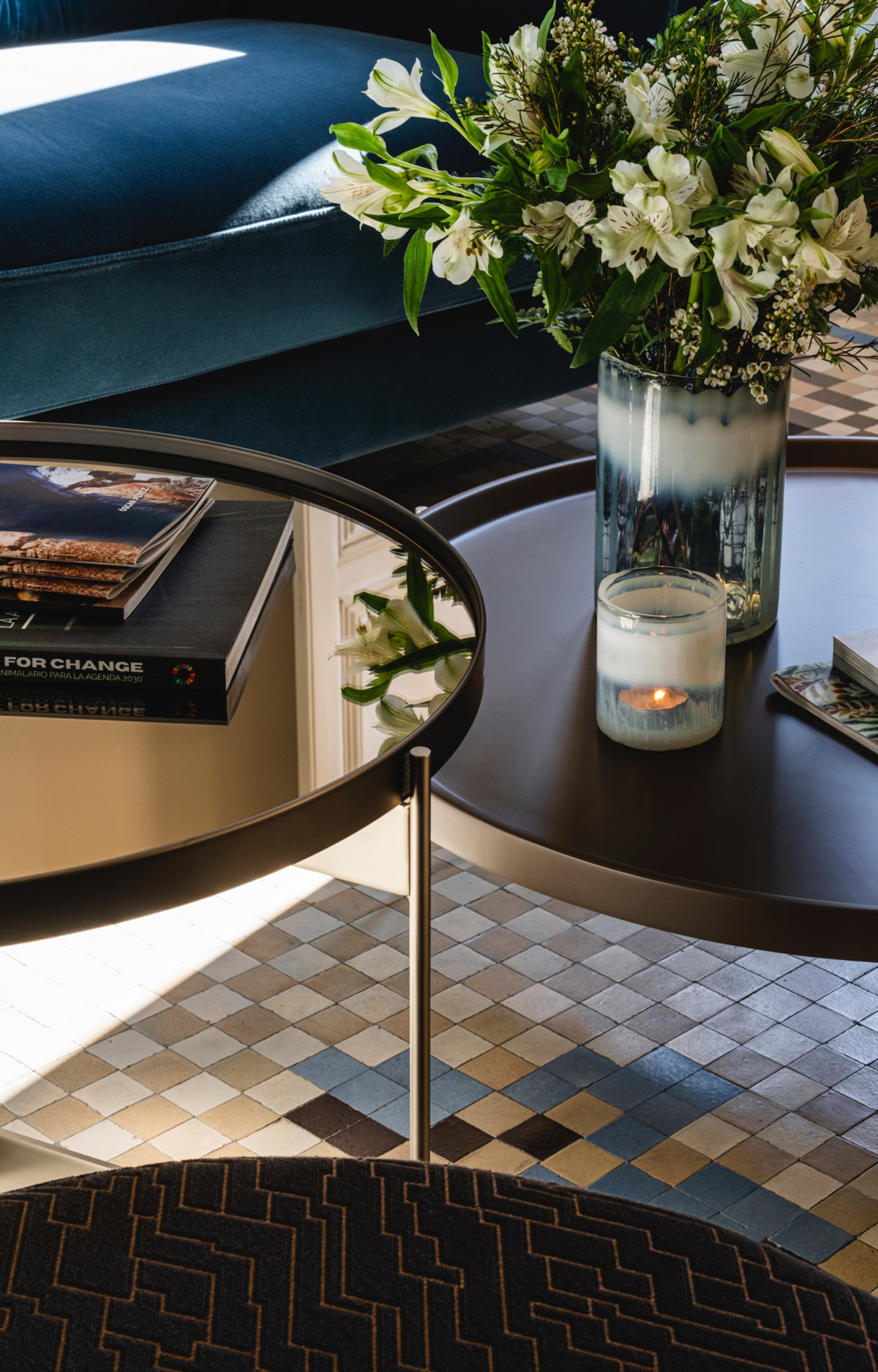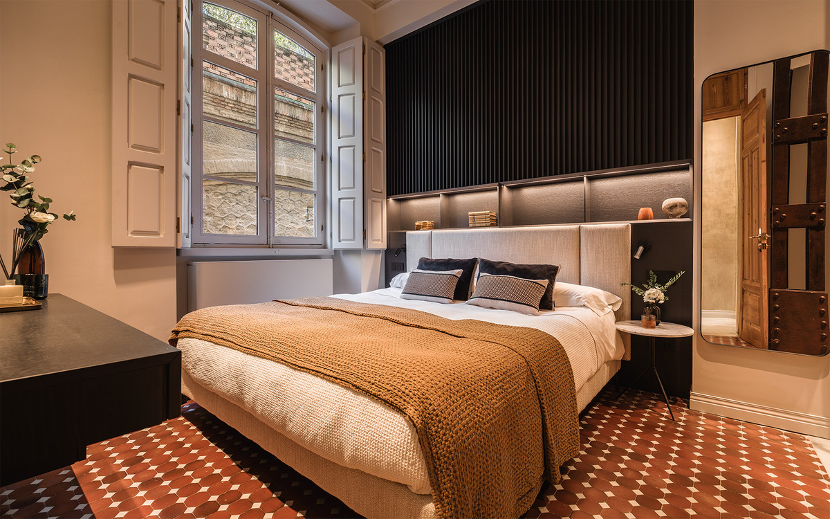 The bathrooms include pieces by Villeroy & Boch and brushed gold fittings by Toro Bath, alongside sober-lined furniture by Inbani. The lighting, designed by Eflux, discreetly enhances the architecture, while furniture by Pianca, fabrics by Casamance, and hand-blown glass fixtures by Bomma complete a setting that combines history, design, and comfort with balance and naturalness.