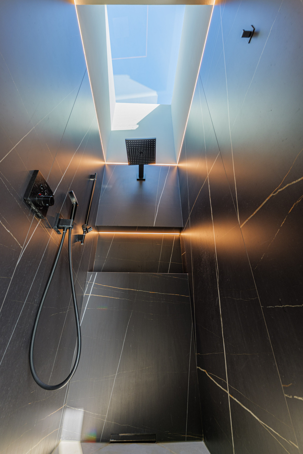 The property is arranged over four perfectly integrated levels, combining spacious and bright areas with a constant connection to the surroundings. The main floor features an elegant open-plan space that integrates the living room, dining area, and designer kitchen with a central island, complemented by large windows that visually expand the home. This level also includes the entrance hall, a guest toilet, and a closed garage for two vehicles. The villa also offers a private pool and a garden with automatic irrigation. The pool area, surrounded by a large covered porch and a paved solarium, creates the perfect setting for relaxation and outdoor gatherings.