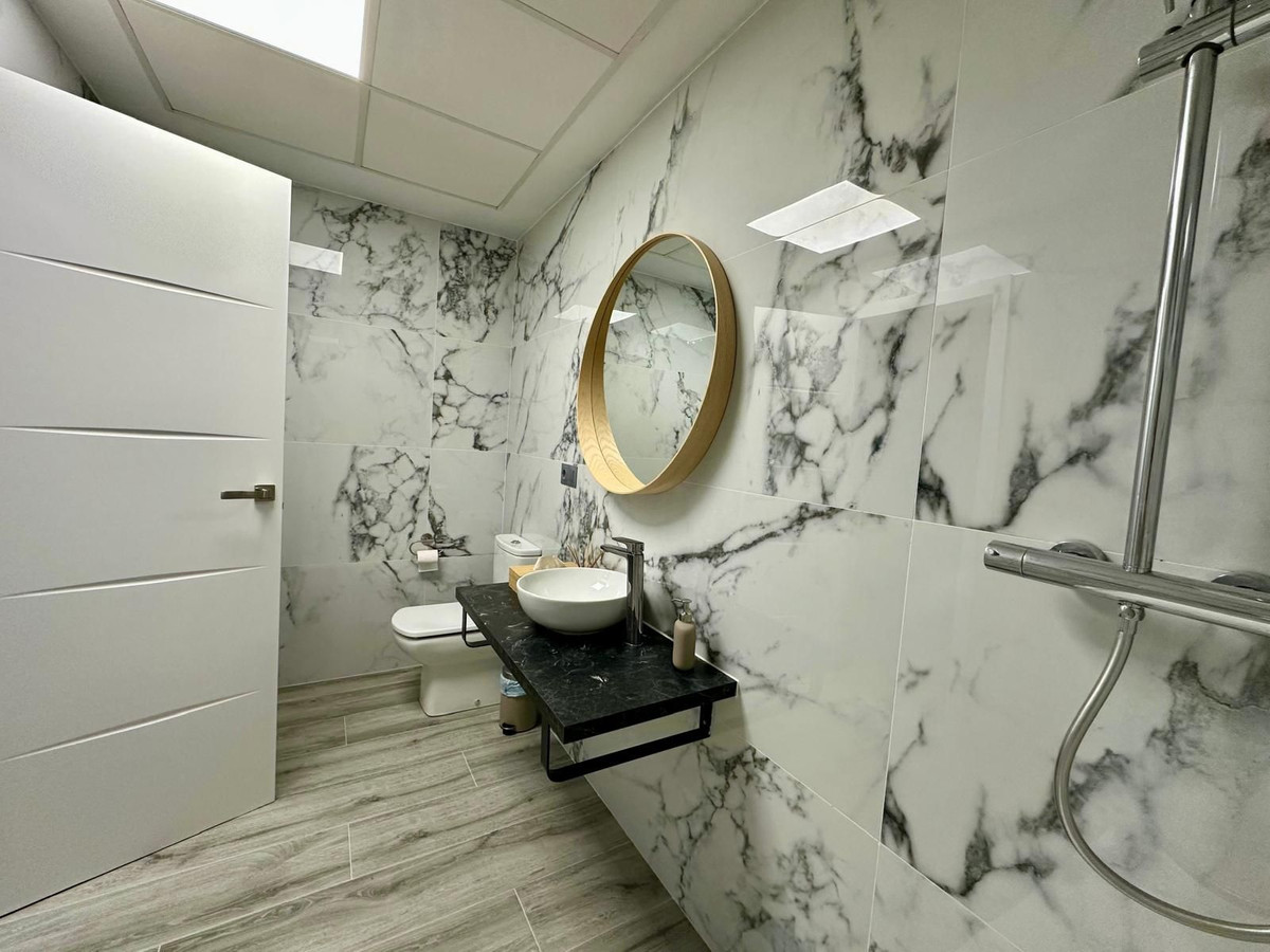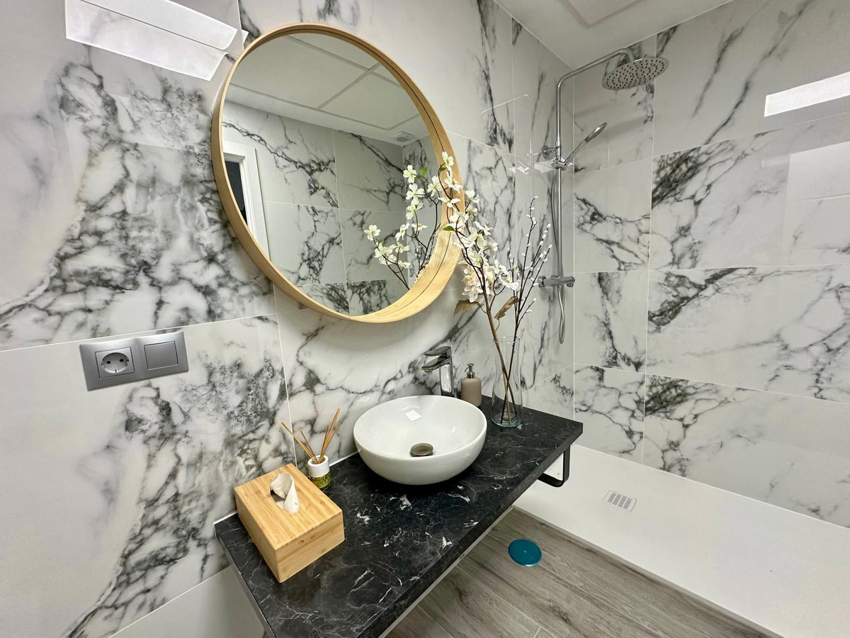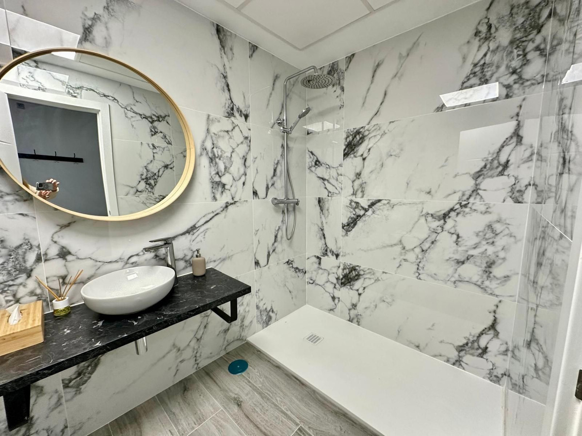 L'appartement comprend une salle de bains moderne et entièrement équipée, la climatisation et un parquet de haute qualité, soulignant son style contemporain et son confort.