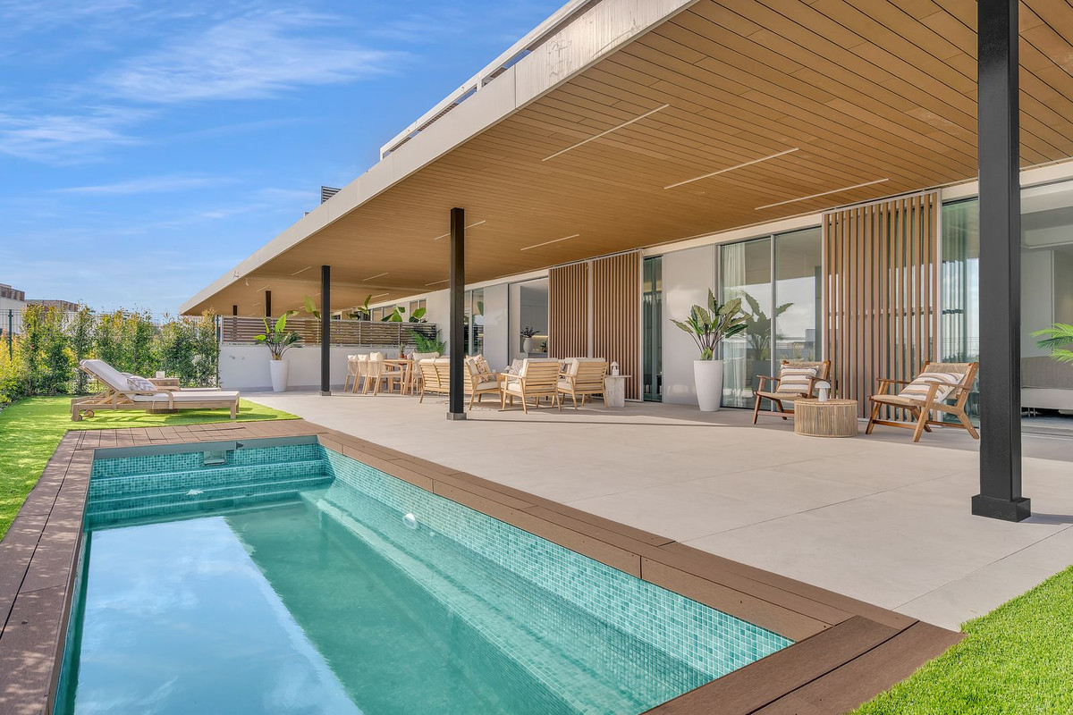 Le vaste espace de vie ouvert, comprenant salon et salle à manger, se prolonge harmonieusement sur une grande véranda couverte, un jardin privé et une piscine privée, créant ainsi un cadre idéal pour la vie en plein air, les réceptions et la détente tout au long de l'année.