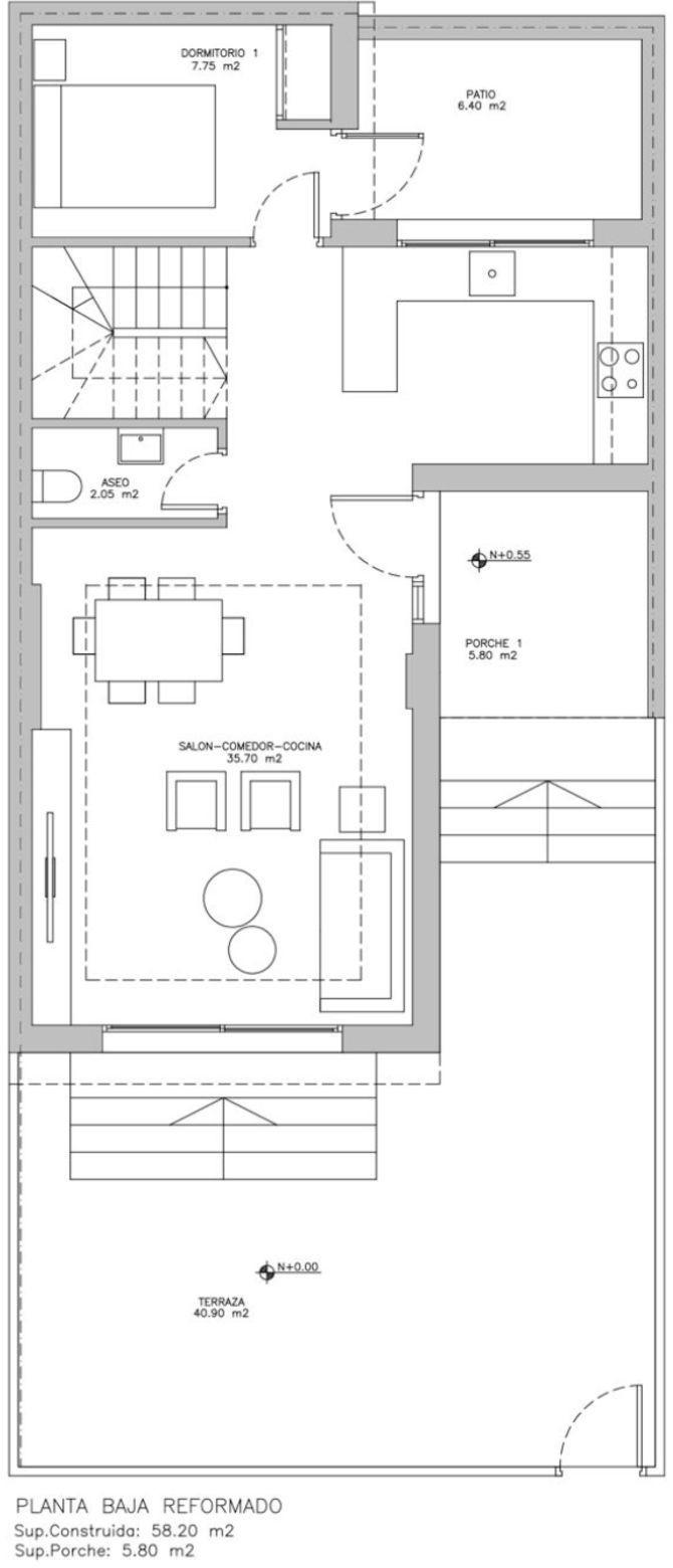 Rez-de-chaussée : 1 chambre, 1 salle de bains, salon et cuisine.