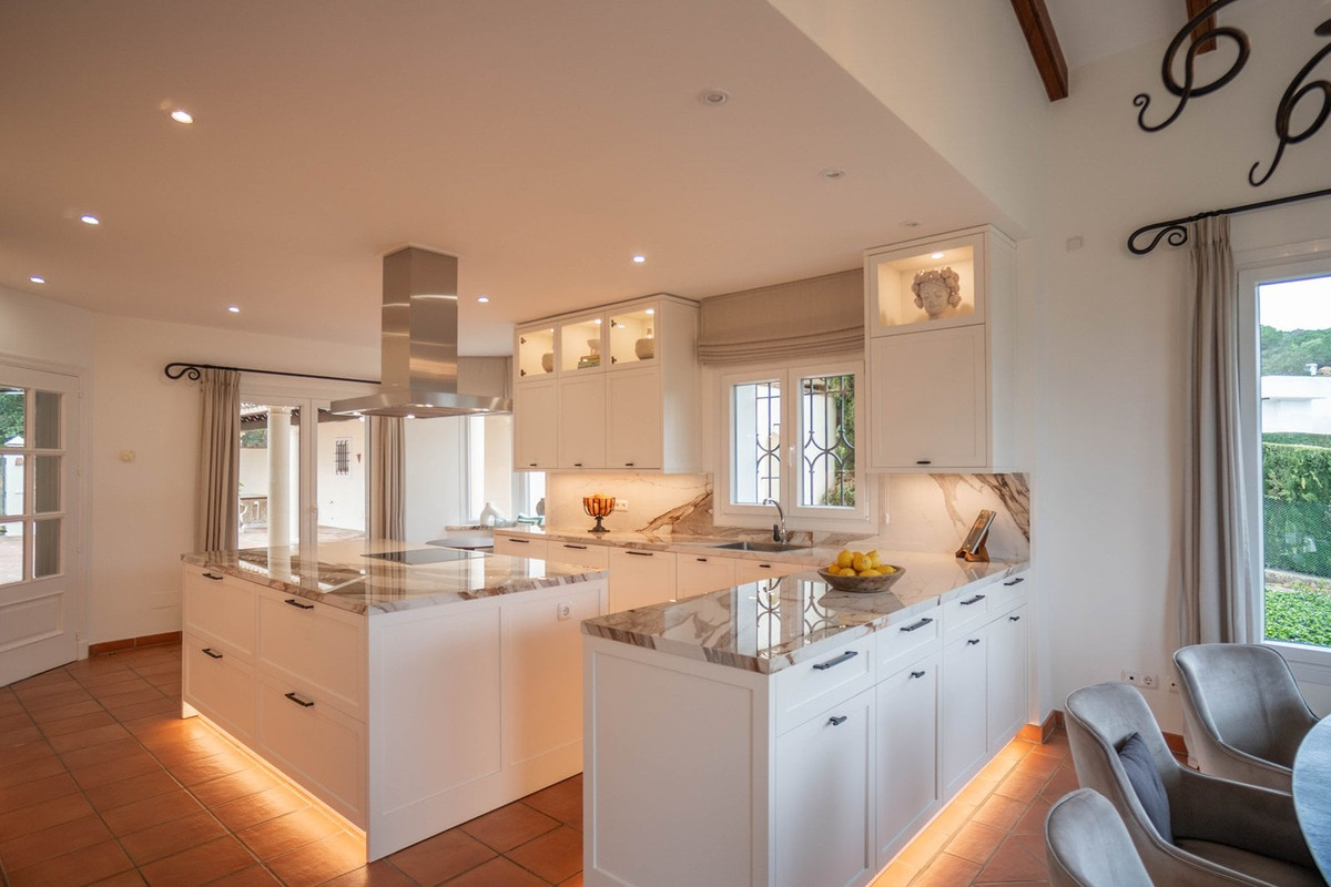 À l'extérieur, des jardins arborés entourent plusieurs terrasses aménagées pour profiter des différentes vues tout au long de la journée. La terrasse avant offre un panorama exceptionnel sur la mer et les montagnes, tandis qu'un grand patio privé à l'arrière garantit une vue paisible sur la forêt et une intimité totale. La propriété comprend également une piscine, deux garages, un garage séparé pour voiturette de golf avec de nouveaux portails Hörmann, un portail d'entrée électrique et bien plus encore.