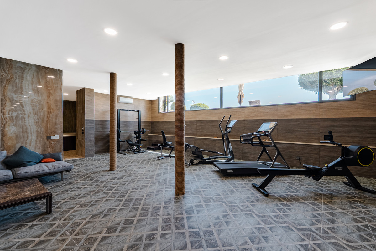 Un niveau inférieur entièrement dédié au bien-être est conçu comme un havre de paix privé, offrant une expérience de vie complète au sein même de la maison. Ce niveau comprend un espace spa avec sauna, hammam et jacuzzi, ainsi qu'une salle de sport entièrement équipée et baignée de lumière naturelle.