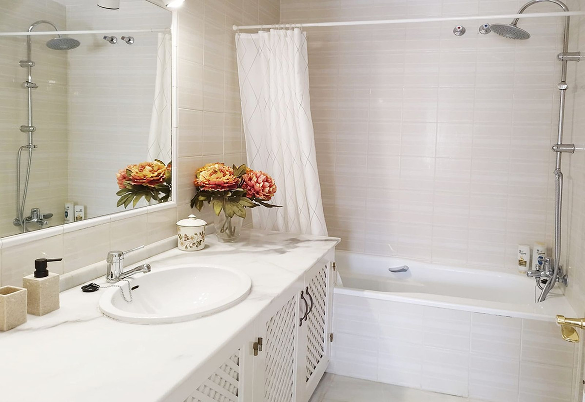 Cette propriété comprend deux chambres spacieuses, une salle de bain complète et des toilettes séparées. La cuisine entièrement équipée inclut une buanderie indépendante, conçue pour une utilisation quotidienne pratique sans sacrifier l'espace. Le sol en marbre, le double vitrage et la climatisation contribuent au confort général.