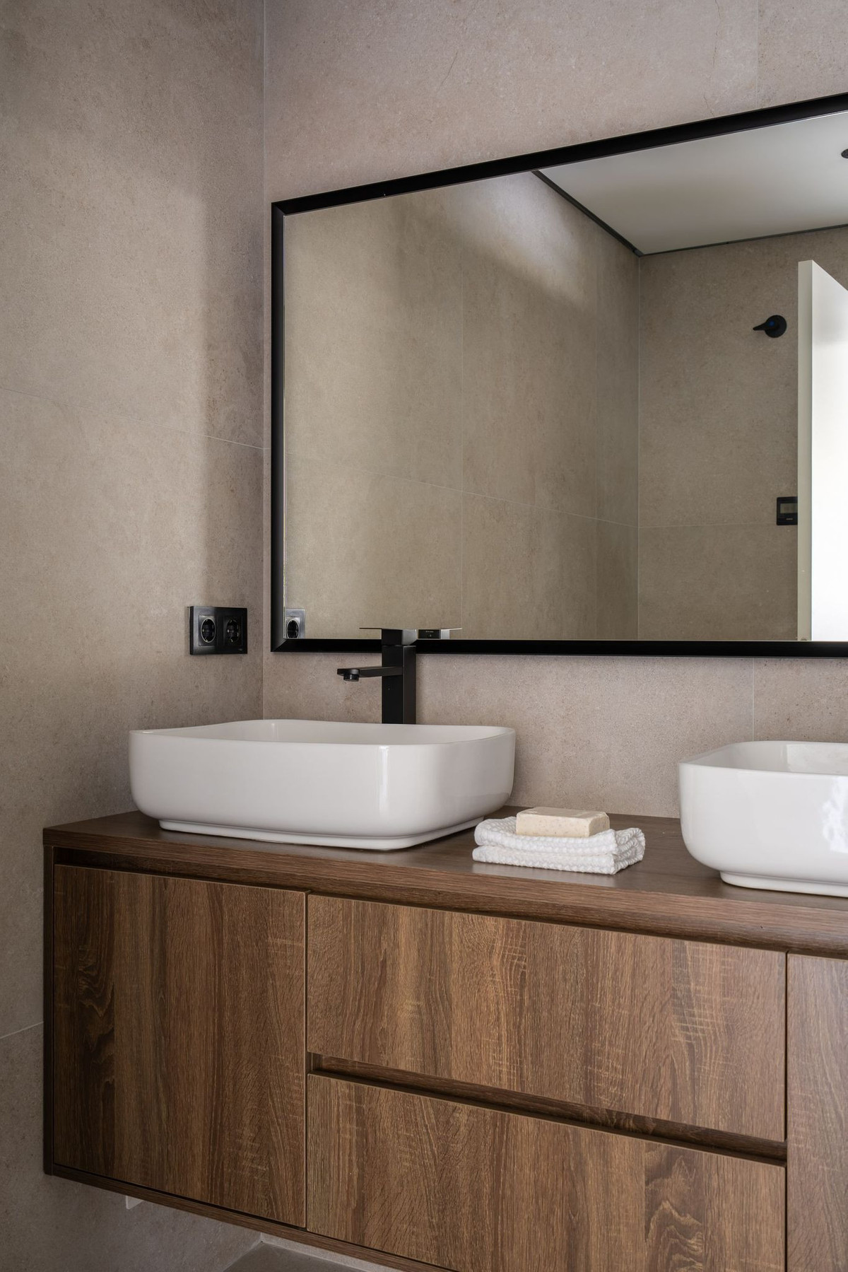 La cuisine élégante et entièrement équipée comprend des appareils électroménagers neufs et des finitions modernes, tandis que les deux salles de bains raffinées sont dotées d'un chauffage au sol pour un confort optimal toute l'année. La propriété offre trois chambres spacieuses, toutes équipées de placards intégrés avec éclairage LED, ainsi qu'un éclairage indirect discret au plafond.
