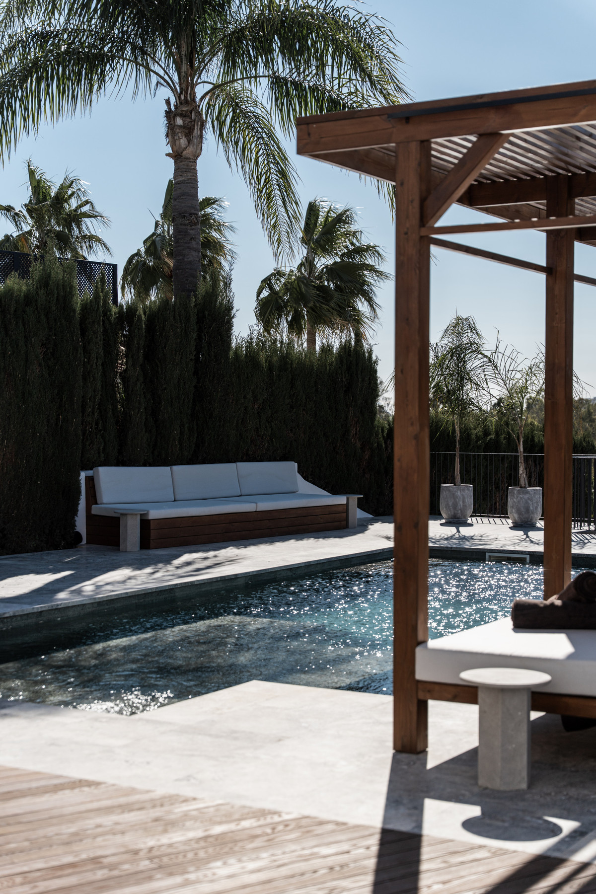 L'espace de vie principal communique directement avec le jardin, où la piscine, la terrasse et le barbecue intégré s'intègrent harmonieusement à la maison. La cuisine et la salle à manger s'ouvrent sur l'extérieur sans interruption, créant un agencement aussi pratique au quotidien que pour recevoir. Les espaces extérieurs, à la fois spacieux et intimes, sont bordés d'une végétation luxuriante et orientés vers le golf.