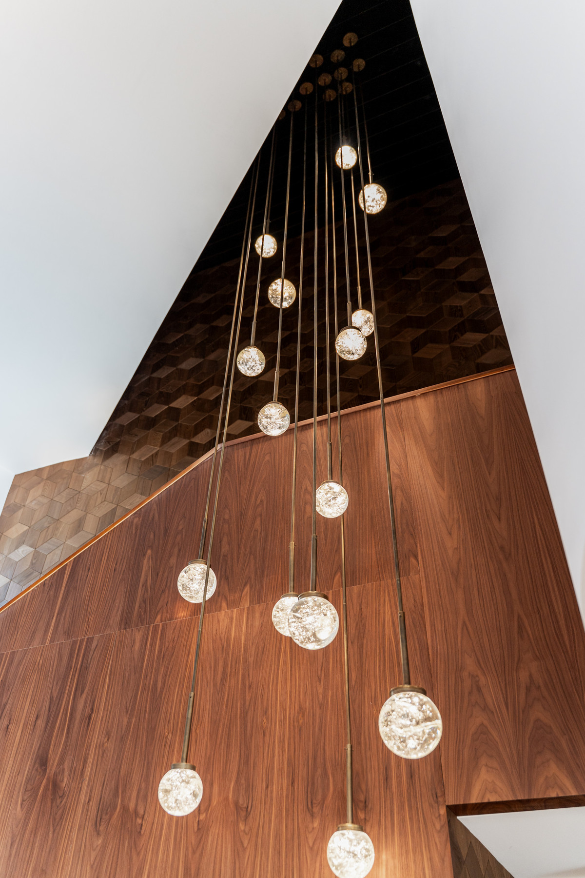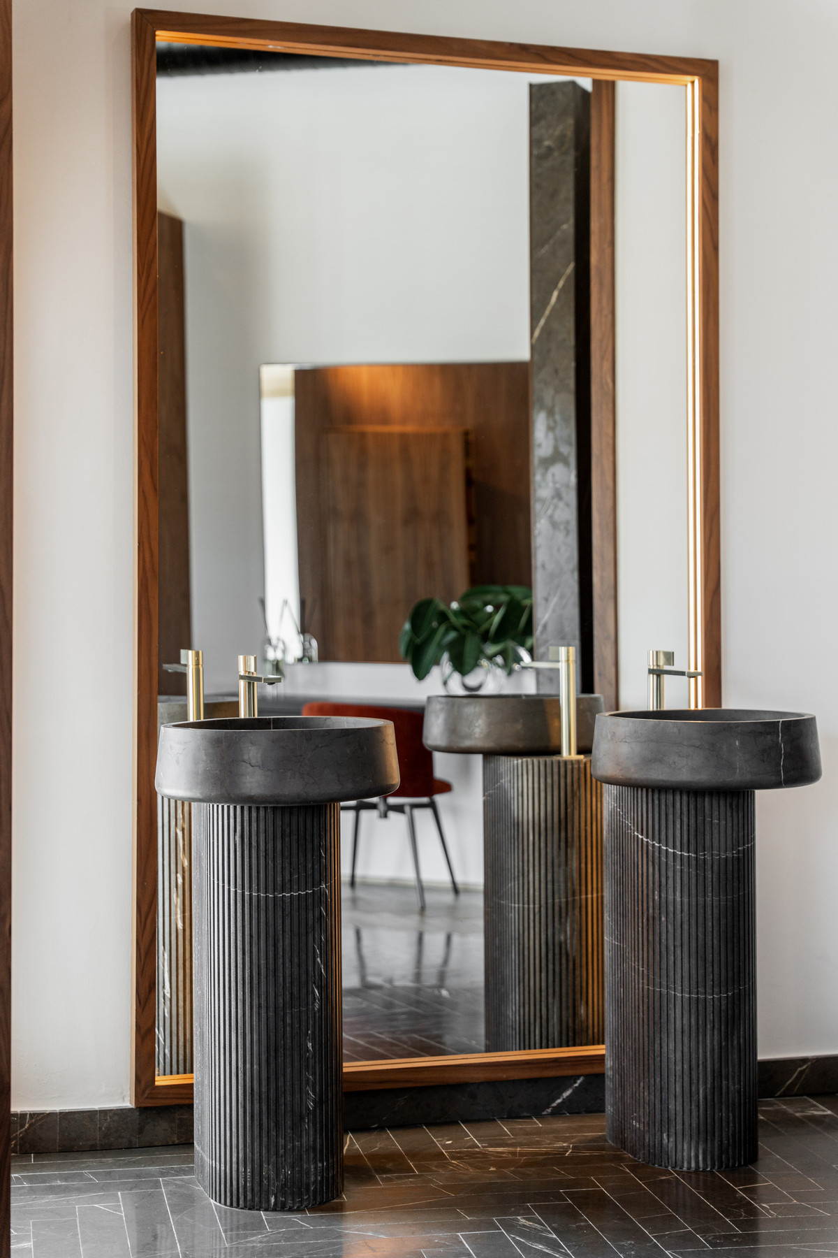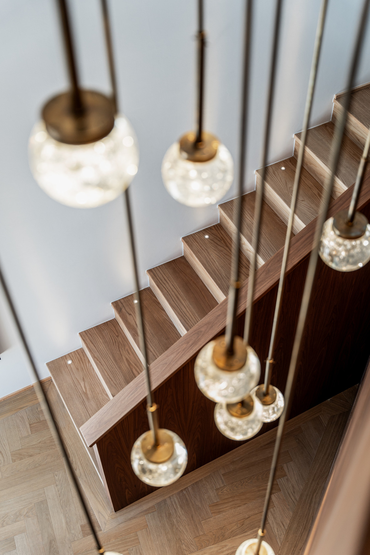 Cette villa de Golf Valley est unique en son genre. Repensée selon une vision architecturale affirmée, elle accorde une attention particulière aux proportions, aux matériaux et à la circulation. Dès l'entrée, le souci du détail saute aux yeux : parquet en chêne à chevrons, menuiseries sur mesure en noyer, meubles cannelés et marbre veiné foncé, le tout harmonieusement agencé plutôt que par un contraste ostentatoire.