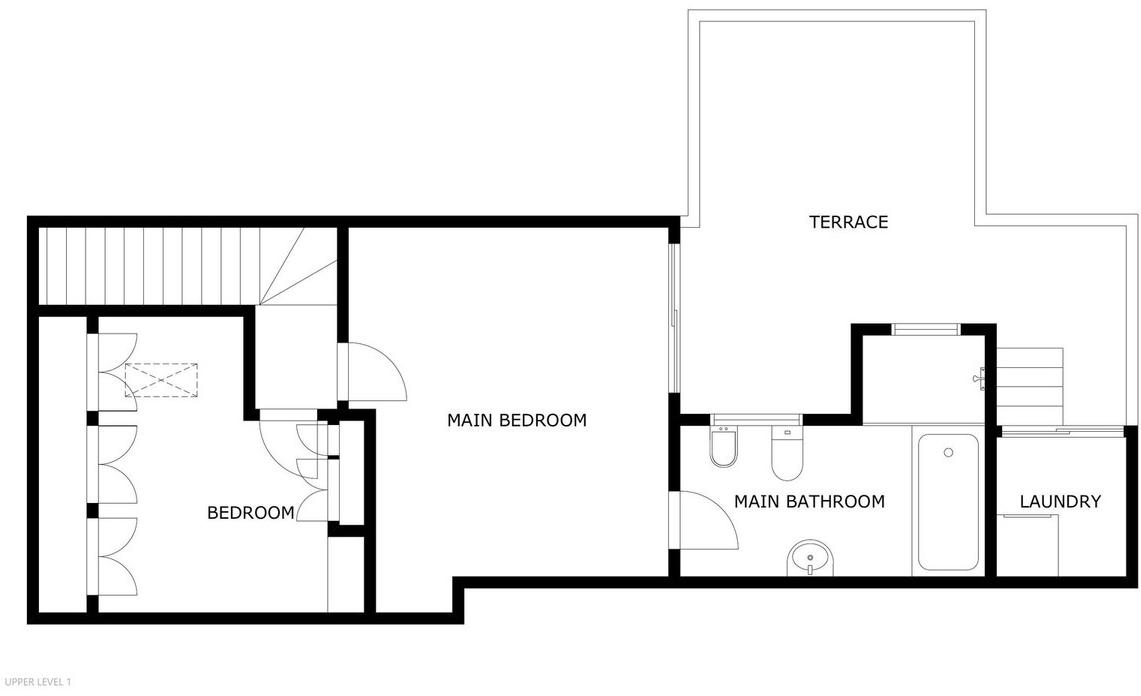 Ce niveau supplémentaire d'environ 46 m² comprend deux chambres, une salle de bains et une buanderie séparée. Grâce à son agencement et à son accès direct à la terrasse sur le toit, il est idéal pour accueillir des invités, aménager un espace de travail ou même créer un logement indépendant.