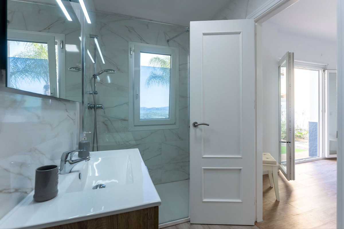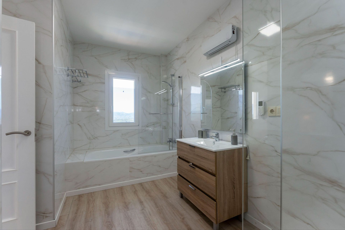 Au niveau inférieur, la propriété abrite une superbe suite parentale avec salle de bains privative et portes-fenêtres donnant directement sur la piscine. Ce niveau offre également un second vaste espace de vie et salle à manger, agrémenté d'une impressionnante cheminée à gaz vitrée du sol au plafond, créant une élégante séparation entre les espaces tout en apportant chaleur et caractère. De là, des portes-fenêtres du sol au plafond mènent à une terrasse couverte surplombant la piscine privée et offrant une vue imprenable sur Álora.