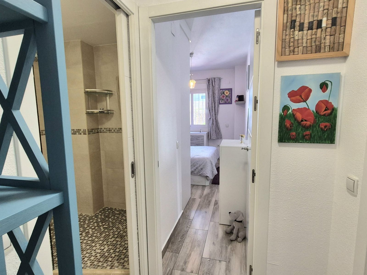 You enter the apartment into a hallway with space for shoes and coats, to the left you have the large renovated fully equipped kitchen with an oven, hob, and extractor. All windows are climate-controlled double glazing. From here you access the fully enclosed back patio, which has tiled flooring, includes a storage shed, and an outdoor tap. Back into the hallway there is a sliding door that gives access to the living/dining room; again, this has patio doors that open onto the front terrace, which is fully enclosed and receives sun during the day until lunchtime. All the floors are covered with ceramic tiles, and the windows have mosquito screen blinds. From the living room, there is another sliding door that leads to a small hallway. To your left, you have the second bedroom, which fits a double bed, and it has a built-in wardrobe. You have a bathroom with a large walk in shower, sink, vanity, Bluetooth mirror, storage, an electric towel rail and has a sliding door, then you enter the main double bedroom, which includes a fully equipped wardrobe with shelves and hanging rails.
