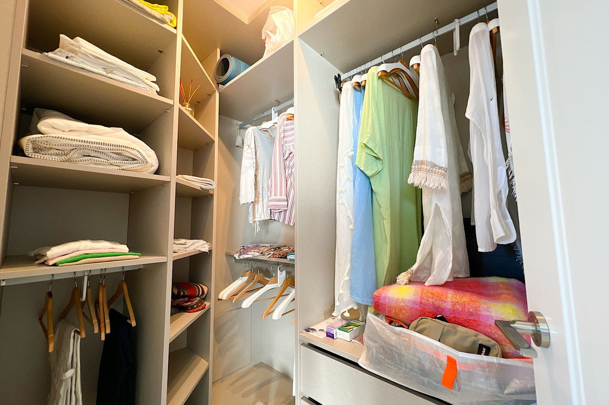 La salle de bains attenante, avec double vasque, receveur de douche, bidet et baignoire, est très bien équipée. Le dressing offre suffisamment d'espace pour ranger de nombreux vêtements.