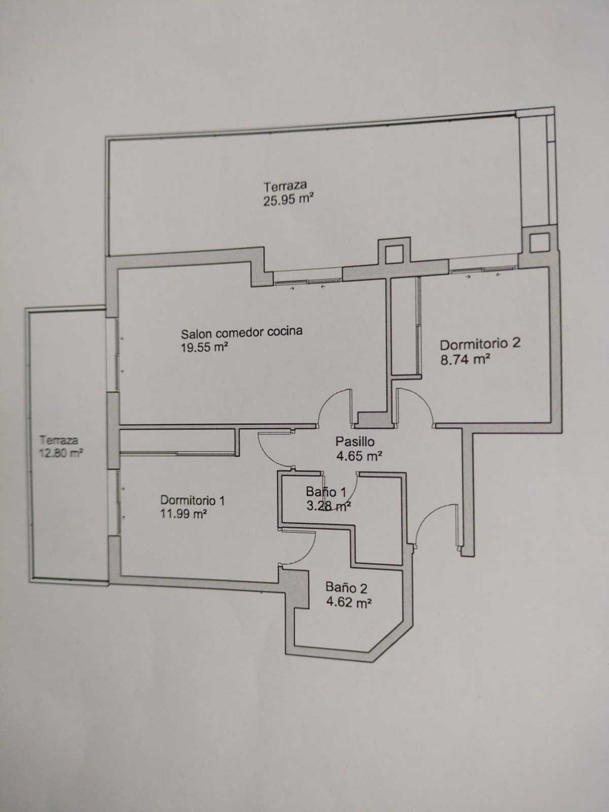un hall d'entrée accueillant, une deuxième chambre, une salle de bains, une chambre principale avec salle de bains attenante et accès direct à l'une des terrasses, et un espace salon-salle à manger spacieux avec possibilité d'installer une cuisine ouverte (non installée) et accès aux deux terrasses.