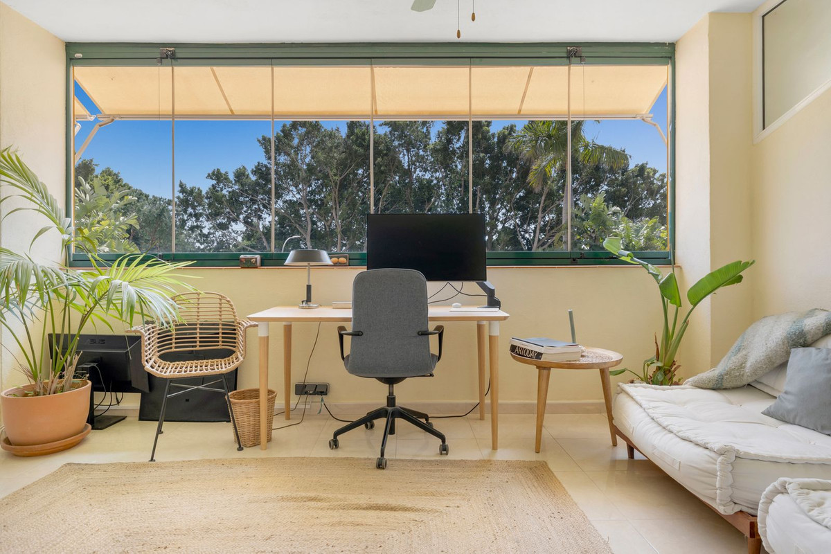 La résidence Las Acacias est un complexe résidentiel sécurisé avec surveillance vidéo 24h/24, interphone, une magnifique piscine commune entourée de jardins arborés luxuriants et une place de parking couverte privative. La résidence est financièrement solide et bien gérée, un atout rassurant pour les acquéreurs. L'appartement lui-même est exceptionnellement privé et d'un calme absolu, niché au cœur d'une végétation luxuriante.