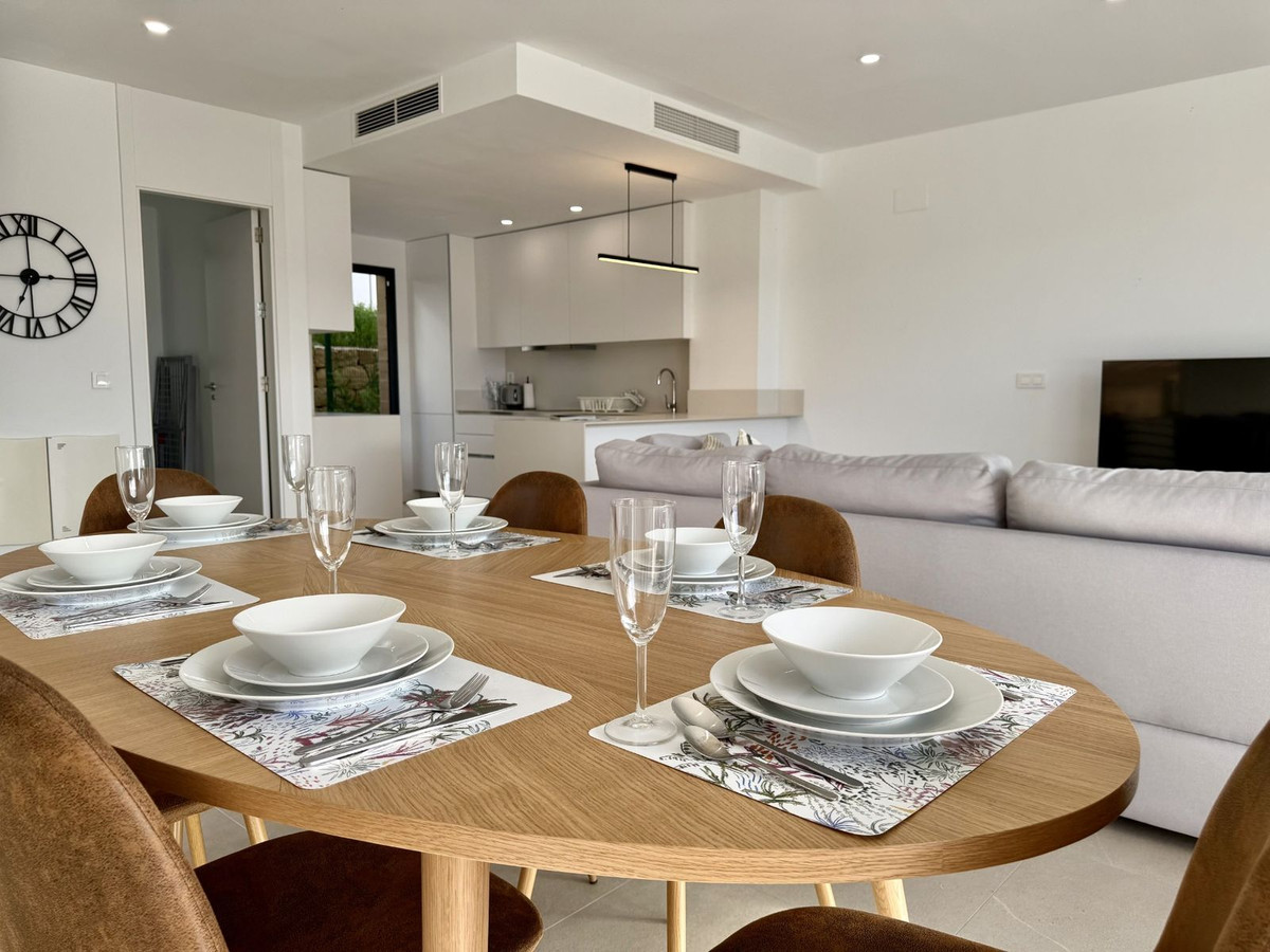 L'espace de vie principal est un espace ouvert combinant cuisine, salle à manger et salon, avec un accès direct à une terrasse spacieuse et une vue dégagée sur les environs.