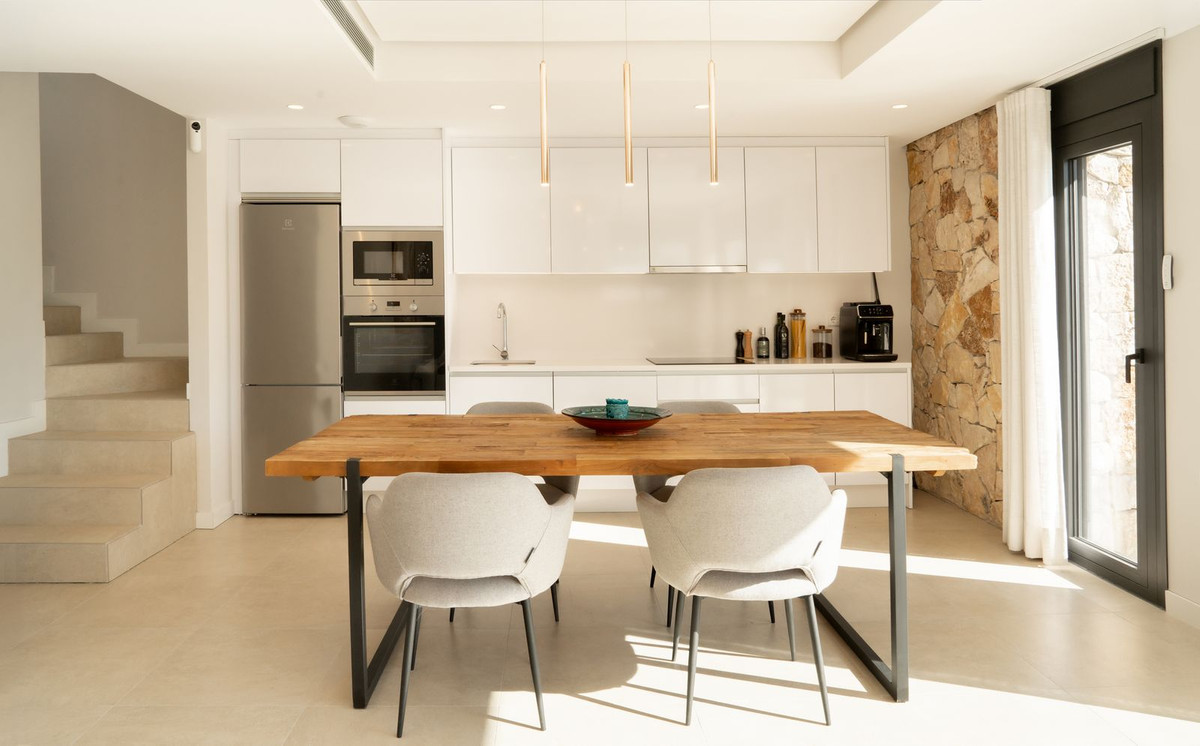 L'appartement, réparti sur deux niveaux, offre une sensation d'espace et de luminosité immédiate. La pièce de vie principale s'ouvre naturellement sur une vaste terrasse grâce à de grandes baies vitrées coulissantes, ce qui agrandit visuellement l'espace et renforce le lien avec l'extérieur. C'est le type d'agencement qui convient aussi bien à la vie quotidienne qu'à la réception de invités.