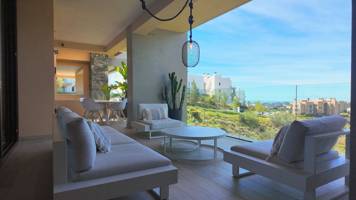 Cet appartement de deux chambres et deux salles de bains, orienté sud-ouest, dispose d'une terrasse couverte offrant une vue panoramique sur la mer, d'où l'on peut apercevoir Gibraltar et l'Afrique par temps clair, ainsi que des vues imprenables sur les montagnes.