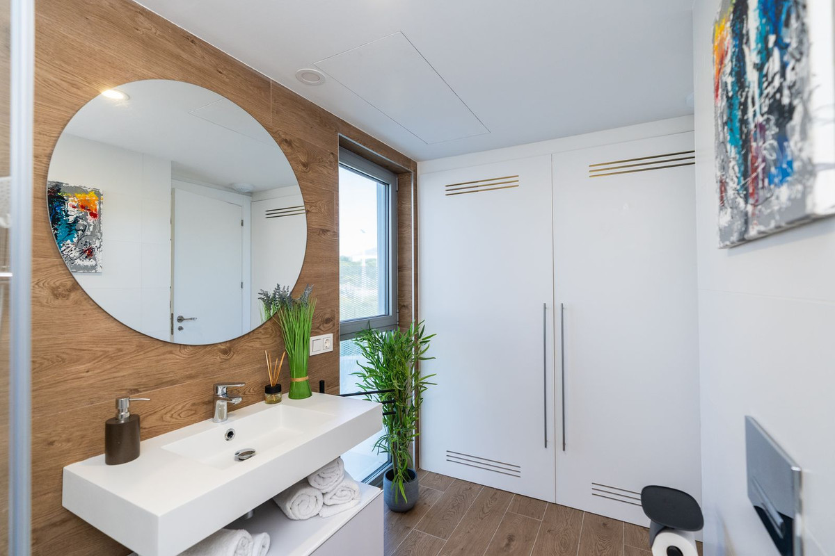 L'espace de vie, lumineux et spacieux, bénéficie de grandes fenêtres laissant entrer une abondante lumière naturelle et offrant une agréable transition vers l'extérieur. La cuisine ouverte, fonctionnelle et équipée d'appareils modernes, permet de cuisiner et de recevoir en toute fluidité. Les chambres offrent calme et intimité, idéales pour un usage personnel ou pour accueillir des invités, tandis que les salles de bains, élégamment aménagées avec des matériaux contemporains, complètent ce tableau.