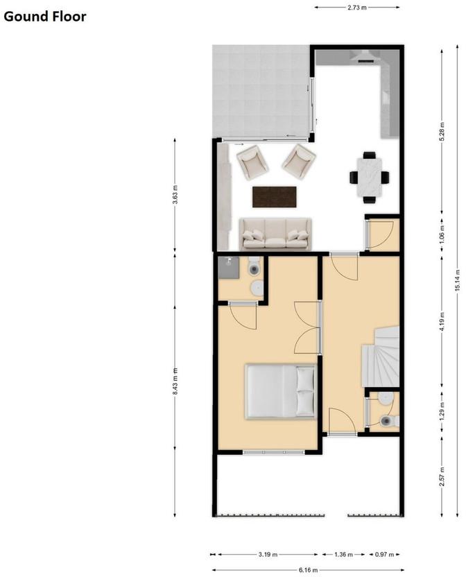 ➡️ Ground floor: Living-dining room , open-plan fully equipped kitchen , 1 bedroom with en-suite bathroom , guest toilet, and 2 patios