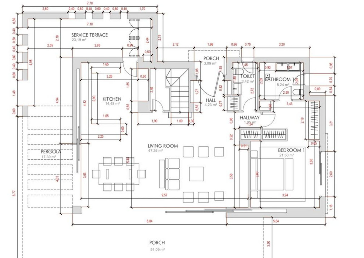 The ground floor boasts a stunning open plan living area, Through the impressive wooden front door which is both wide and tall, one enters the living room area, where the immediate impact of space and light create the feeling for this fabulous la Cala Golf villa. Floor to ceiling high quality patio doors flank all of the walls and are designed to slide delightfully into the walls, allowing that the interior open plan living space blends into the perfect alfresco experience by incorporation with the south-facing terrace. This terrace is further improved with the addition of glass curtains, meaning that come rain or shine, the outdoor space of this property is to be enjoyed, with the lovely views of the green and verdant gardens and the countryside beyond.