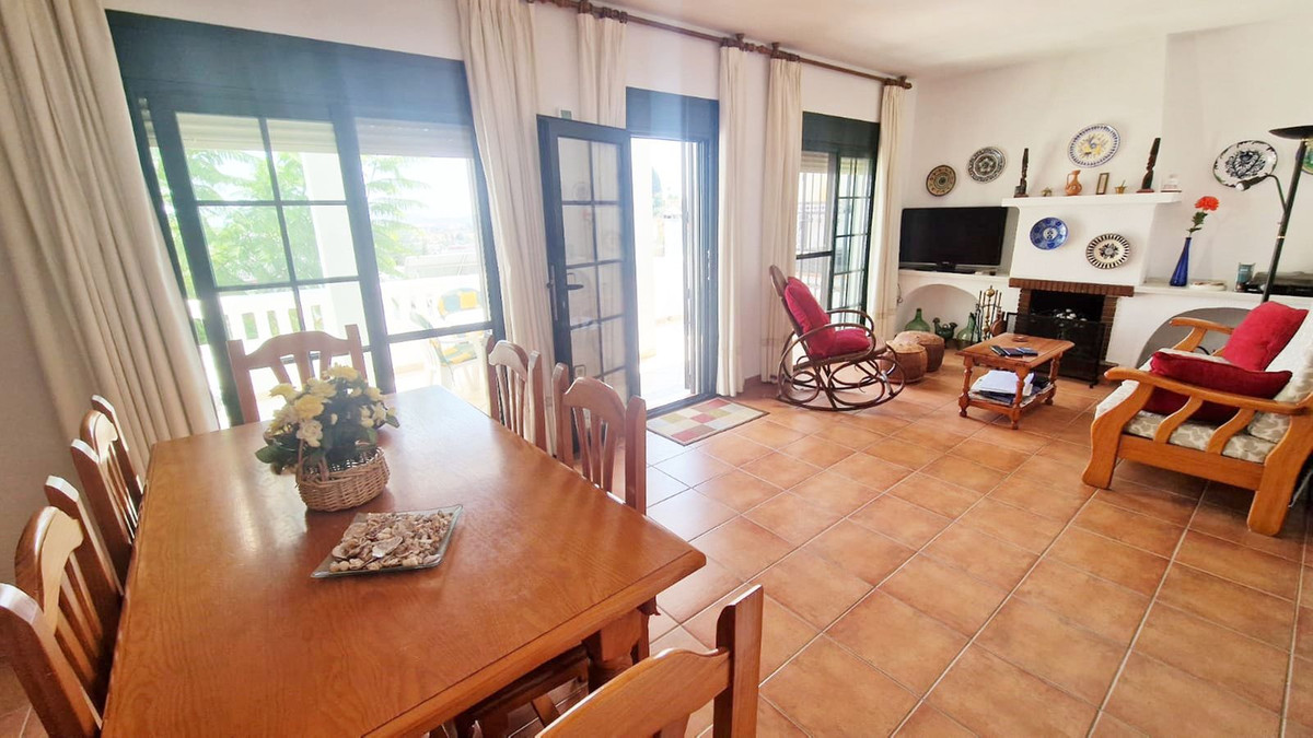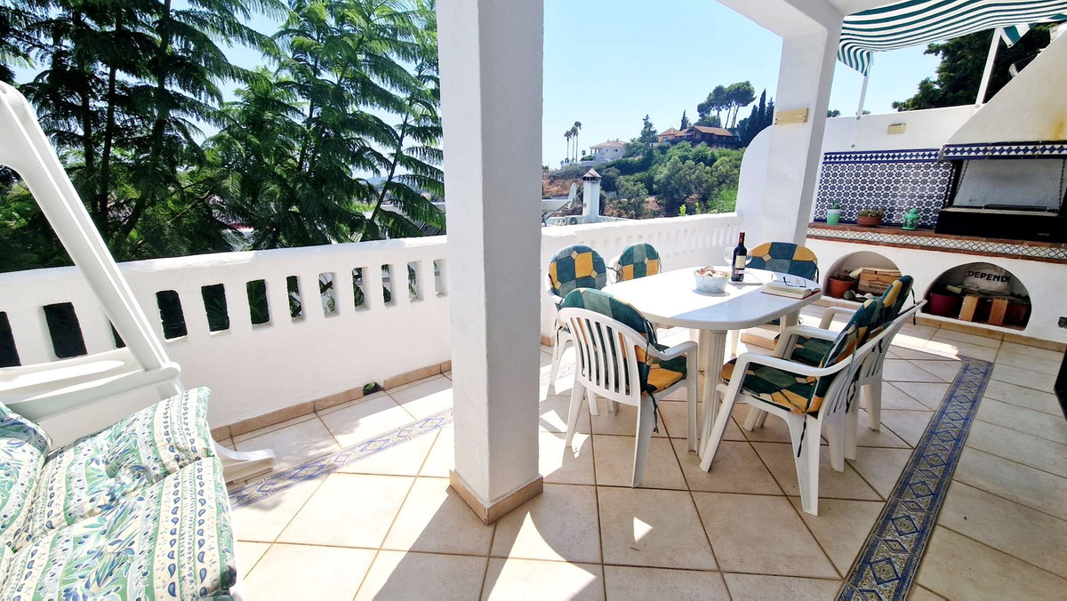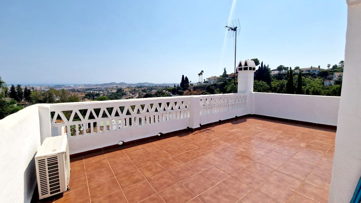 Partially renovated townhouse in Mijas with panoramic views. Spread over 3 floors, it features 3 bedrooms, terraces on every level, a solarium, modern kitchen, and BBQ terrace. Community pool & gardens included. Peaceful location just 5 minutes from town!