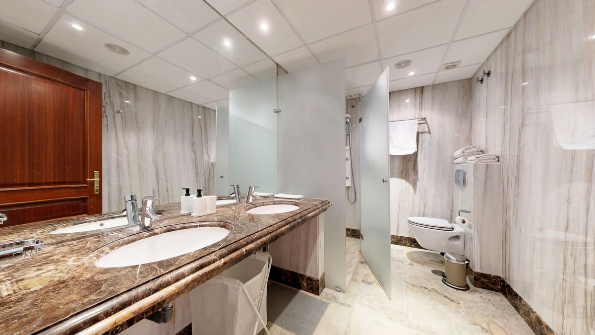 This spacious two-bedroom, two-bathroom apartment offers a bright and functional design that opens onto a large south-facing terrace with direct views of the Mediterranean. Every corner has been conceived to convey spaciousness and well-being, integrating indoor and outdoor living in a natural way. Here, days begin with the sun streaming through the floor-to-ceiling windows and end with the sea breeze as your companion.