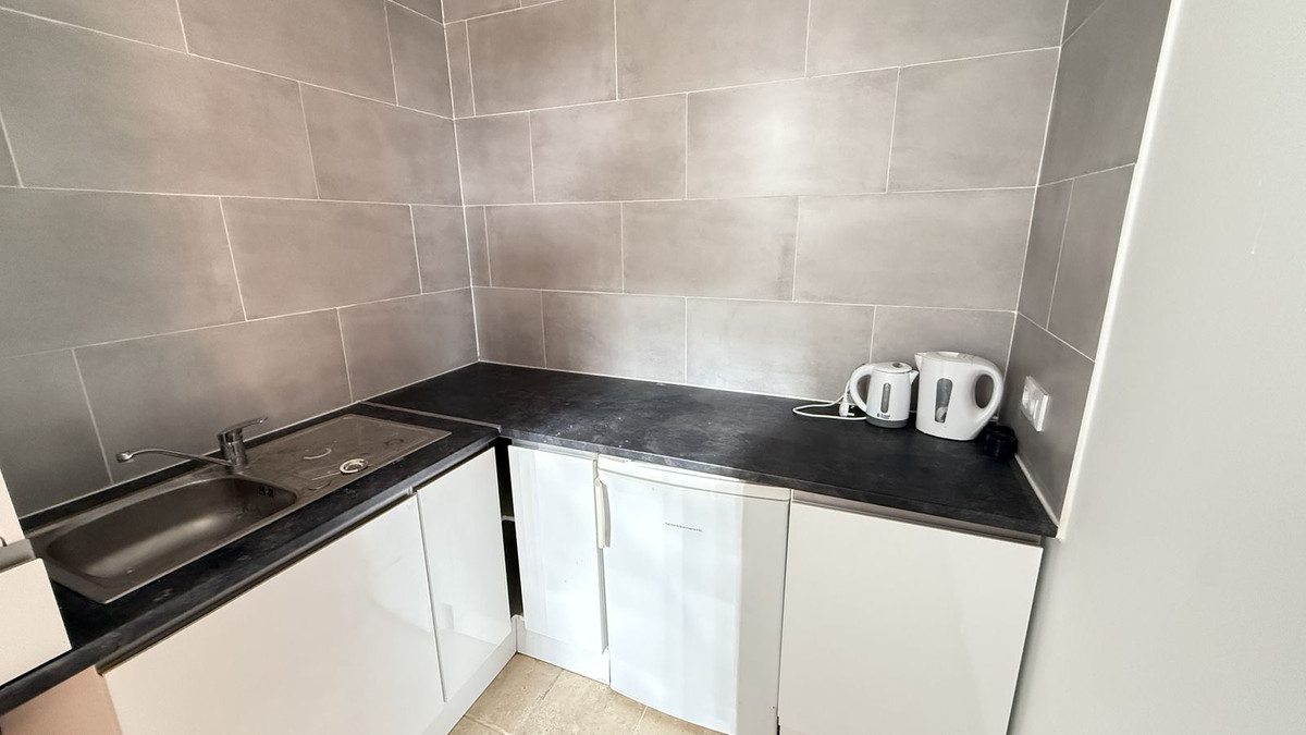 Apartment 2 is a large studio with double door access to the terrace and pool, a good-sized fitted kitchen, and a bathroom. There is plenty of room to have a designated sleeping area and living-dining area or even build a wall to create an independent bedroom.
