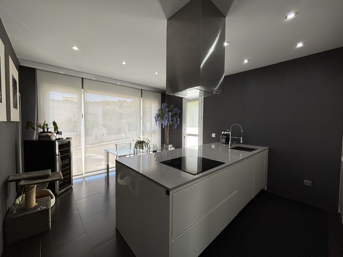 The open-plan living area connects to a modern kitchen and opens out to sunny terraces, a landscaped garden, and a private pool. On the rooftop, a large terrace provides panoramic views of the golf course and surrounding landscape — perfect for relaxing or entertaining.