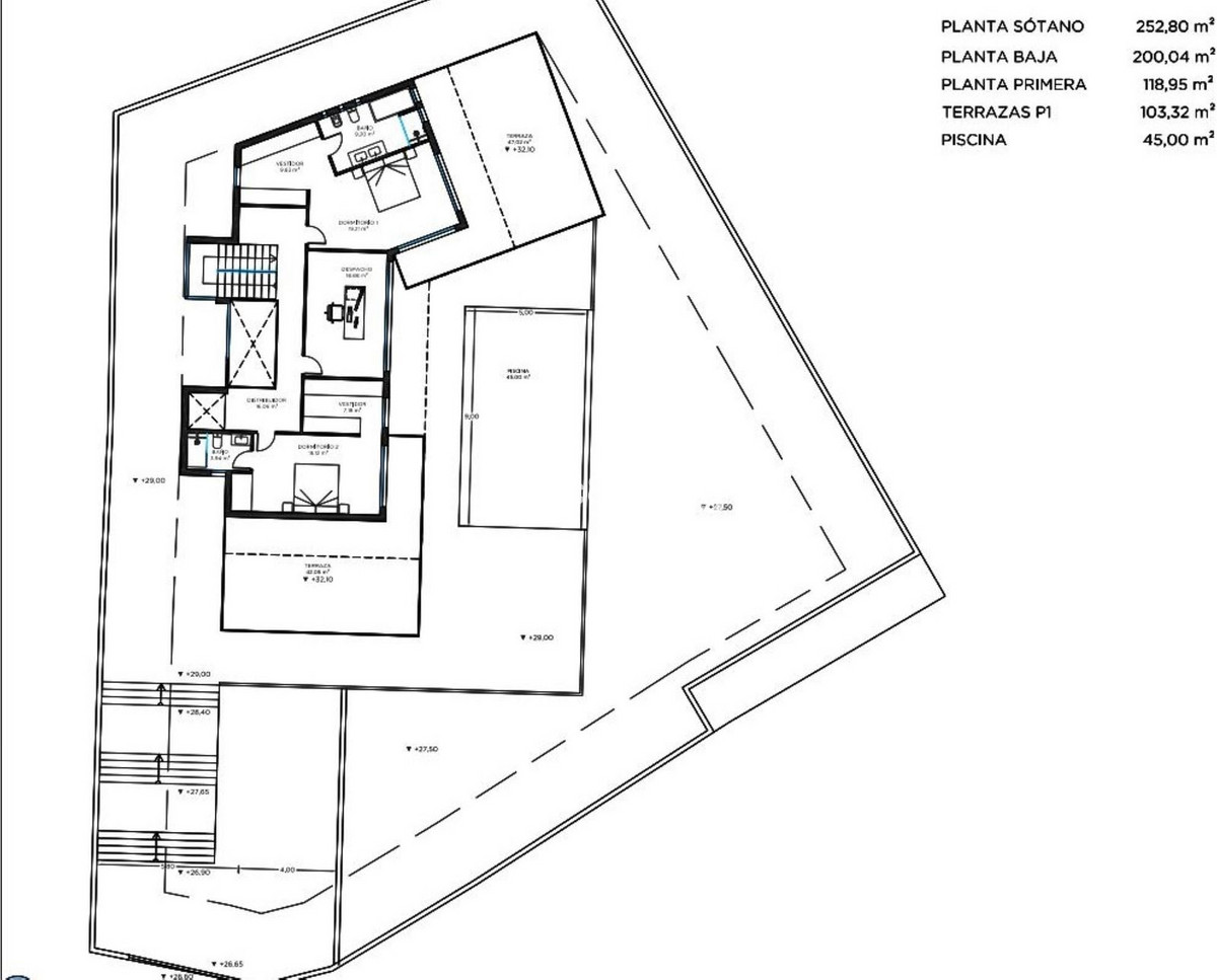 First floor with two large en-suite bedrooms, study and another full bathroom. In addition, a terrace of over 100 m² with spectacular sea and mountain views. Finally, the large basement of over 250 m² houses a spacious car park for several vehicles, a machinery room and a huge area that could be used to create a guest apartment, cinema, wine cellar, games room or whatever the new owner desires.