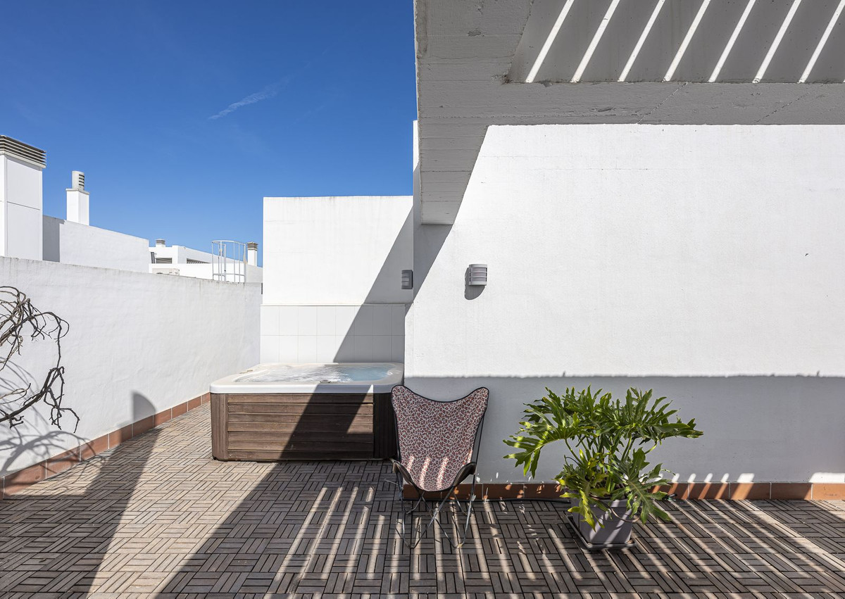 The upper floor is dedicated to enjoyment: an impressive private solarium with a jacuzzi, chill-out area, outdoor dining area and barbecue, designed as a true oasis where you can relax or entertain guests with the best views and the privileged climate of the Costa del Sol.