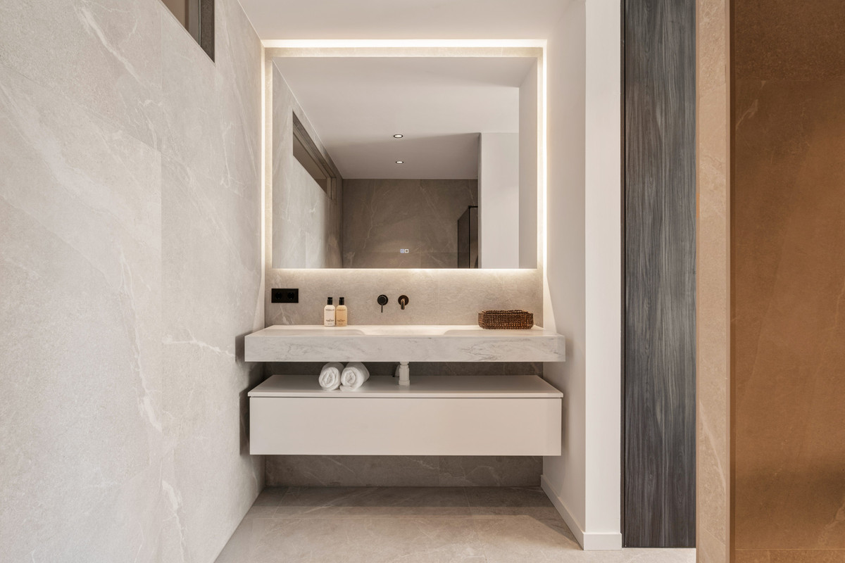 On the upper floor, the three bedrooms are laid out to provide privacy and convenience. Each has an en-suite bathroom and direct access to a terrace, creating private outdoor spaces with outstanding sea and mountain vistas. The master suite stands out with a larger terrace, spacious proportions, and a refined interior atmosphere. These features create a perfect balance of functionality and relaxation, allowing residents to enjoy views that capture the essence of the Costa del Sol.