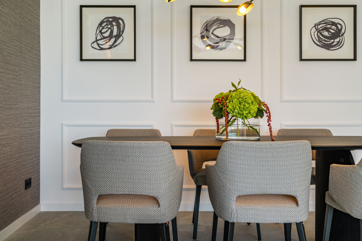 The property benefits from architectural input by a well-known designer and has been recently renovated by Casa Renovo, further upgrading finishes and materials. The interiors are currently styled with elegant wooden furnishings that highlight warmth and quality, complementing the sleek architecture. While these pieces are not included in the sales price, they have been carefully curated to match the home’s aesthetic and can be acquired separately if desired. Outdoors, a generous terrace accommodates an al fresco dining area, an outdoor kitchen, and a built-in barbecue, all set against the backdrop of the valley and the sea. Communal facilities include a large swimming pool and landscaped gardens that contribute to the sense of privacy and community.