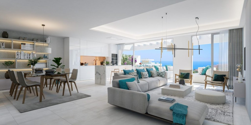 The apartment benefits from high end fittings and fixtures, including open plan kitchens A-rated energy appliances as standard and has views of the sea due to the hilltop location.
