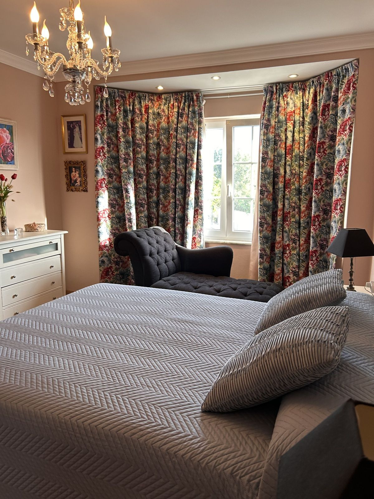 Elegant entrance hall, separate dining room, fully equipped kitchen, cozy living room with fireplace, additional guest lounge, laundry area, guest toilet, and private garage.