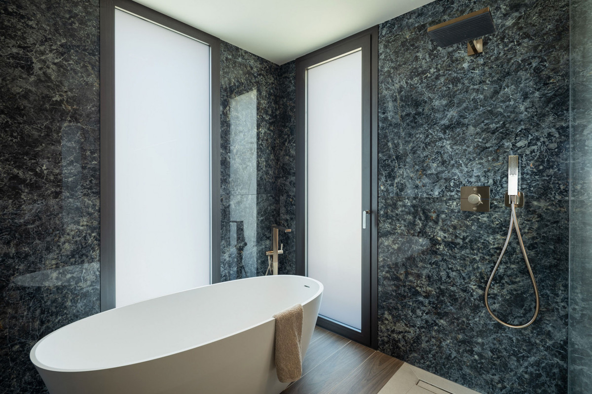 The interior is defined by its modern design and exceptional craftsmanship, featuring a polished concrete staircase with button glass balustrade, and Q-Rail glass systems enhancing the terraces. Bathrooms are fitted with sleek Hansgrohe rain showers, porcelain built-in shower trays, and wall-mounted WCs with concealed cisterns—all designed for a clean, contemporary aesthetic.