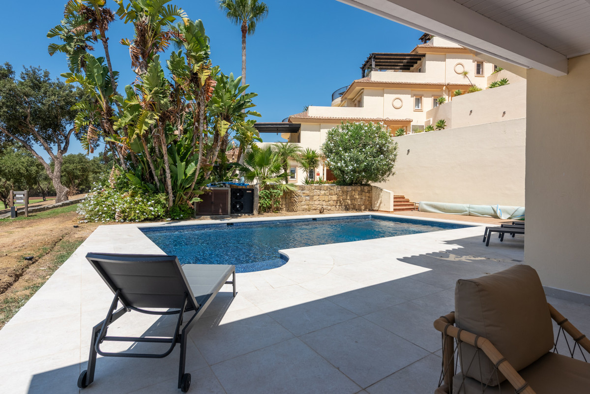 Spacious and bright, it offers a beautiful fully equipped open-plan kitchen and a large living/dining room with breathtaking views of the magnificent San Roque golf course. Both the kitchen and the living area feature large sliding glass doors that open onto a spacious terrace of over 70 m² and a private garden totaling 379 m², facing the golf course.