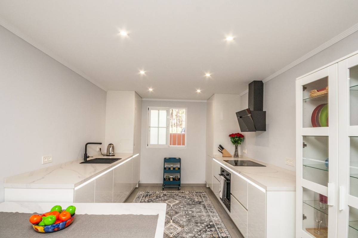 This beautifully refurbished ground floor apartment is located in the sought-after area of Elviria, just a 2 minute walk to the beach and right in the heart of the village, next to local shops, restaurants and local amenities. The property offers 124 m² of stylish living space plus a 27 m² private terrace, perfect for enjoying the Costa del Sol sunshine and relaxing with views of the lush gardens and communal pool. Inside, you’ll find a bright and modern layout featuring a brand new fully fitted kitchen, spacious living and dining area, and two generous bedrooms, both with fitted wardrobes. The master bedroom includes an en-suite bathroom. Situated in an exclusive gated complex, residents benefit from beautifully maintained communal gardens, a large swimming pool, and underground private parking.