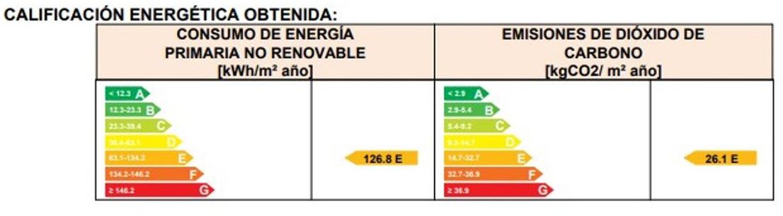 Energy certificate with rating E, energy consumption 126.8 and emissions 26.1.